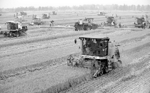 圖為聯(lián)合收割機在河南省唐河縣桐寨鋪鎮(zhèn)收割小麥 資料圖