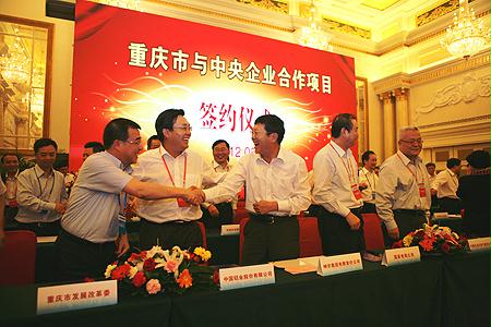 5月16日下午,重慶市與中央企業(yè)項(xiàng)目合作簽約儀式在渝隆重舉行,標(biāo)志著雙方的戰(zhàn)略合作進(jìn)入全面發(fā)展、深入推進(jìn)的全新階段。國(guó)務(wù)院國(guó)資委主任王勇和重慶市市長(zhǎng)黃奇帆講話,國(guó)務(wù)院國(guó)資委副主任邵寧、黃丹華出席儀式。