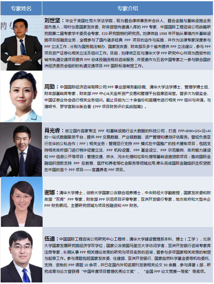 一、基礎設施和社會事業投資建設領域采用PPP模式,既能體現發揮市場配置資源的決定性作用,同時又能體現更好地發揮政府作用,是我國推進公共服務供給側結構性改革的重要舉措,對于理順政府與市場關系,加快政府職能轉變具有特殊重大意義,代表著我國基礎設施投融資建設領域體制機制深化改革的重要方向,受到黨中央、國務院、各級政府、金融機構及各類企業的高度關注,并在我國掀起了推廣應用PPP模式的高潮。 二、由于我國PPP制度頂層設計不完善、投融資體制改革不到位、政府職能轉變滯后、社會資本投資權益保障制度缺失、政策及法律體系不完善、部門之間缺乏統一有效的協調機制、項目參與各方信用履約機制不健全、專業咨詢服務能力不足等原因,使得我國PPP模式的推廣應用產生各種潛在問題及風險隱患,引起社會各界高度關注。 三、正確理解PPP模式的核心理念,規范PPP項目的操作流程,加強PPP投資的戰略管理,提高PPP項目財務分析、融資方案策劃及實施方案的編制質量,加強PPP項目的績效評價,做好爭議解決及風險管控的應急預案,全面提升PPP項目前期論證及實施質量,迫切需要系統更新PPP項目參與各方的知識結構、強化專業能力建設,打造一批掌握扎實基礎理論、專業技能及實操經驗的PPP高級專業人才。 四、我國眾多機構過去三年來開展的大量PPP培訓,難以滿足當前PPP項目運作的實際需要。國家發展改革委組織清華大學PPP研究中心及中國經濟導報社等機構開展的PPP全國巡講,對于正確理解PPP的基本理念、政策法規、操作流程、合同體系、融資操作等發揮了積極作用,極大地激發了全國各地廣大學員在此基礎上更加系統、深入地學習掌握PPP操作專業技能的巨大熱情。為了更好地滿足社會各界的迫切需要,中國國際工程咨詢公司專業團隊決定在總結以往PPP培訓經驗教訓的基礎上,策劃推出“中咨PPP高級人才研修班”全新PPP高端培訓品牌,為促進PPP模式在中國的健康發展貢獻力量。