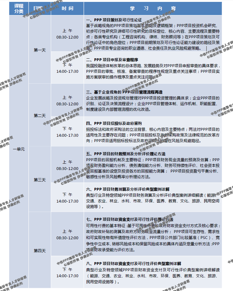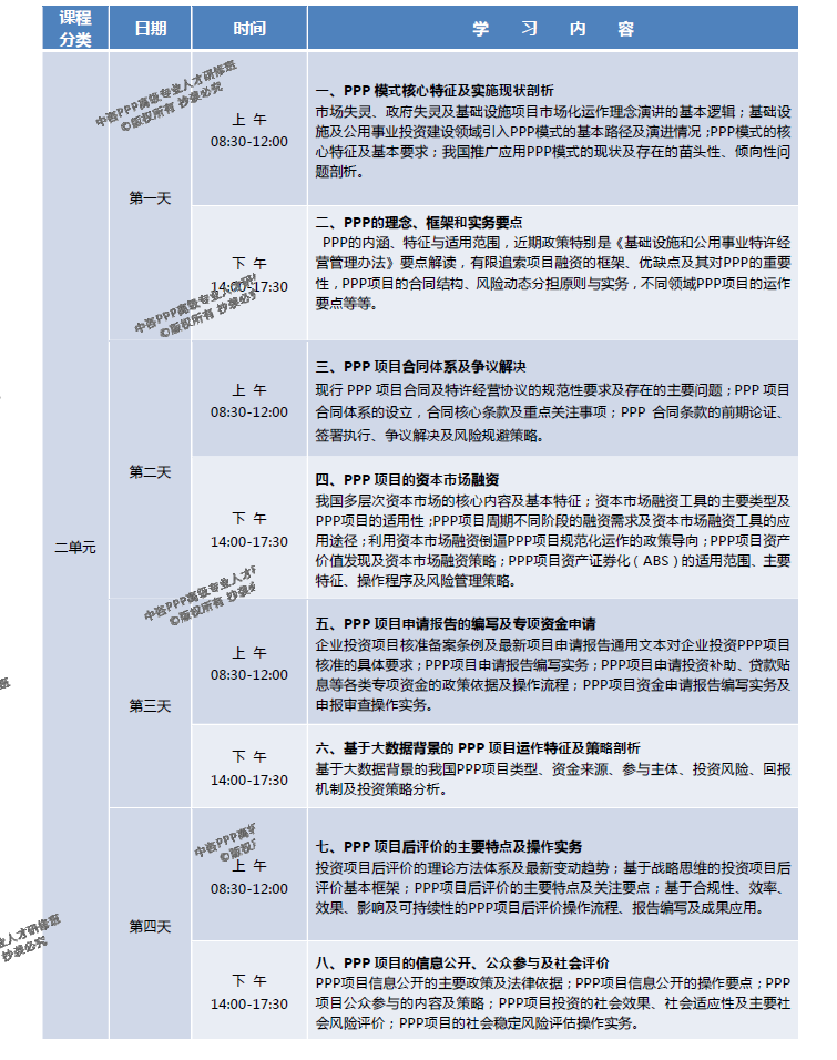 1、專家組在廣泛調研和全面總結2014年以來全國各地開展的大量PPP專題培訓具體經驗及存在問題的基礎上,充分考慮我國PPP項目運作的實際特點、從業人員所接觸的PPP知識結構現狀及未來引導PPP模式健康發展的實際需要,通過系統論證和充分研討,最終確定包括24個專題共108個學時的“中咨PPP高級人才研修課程體系”。 2、希望通過三個單元共12天的系統性高強度集中學習,糾正過去培訓所傳導的對PPP的各種錯誤理解,甄別當前PPP相關政策文件的核心精神及主要缺陷,重新梳理我國今后推動PPP模式健康發展的核心理念,全面掌握PPP項目實施方案編制、融資方案策劃、產出績效評價、風險分析及規避策略、招投標及政府采購、商務策劃及財務測算、財政資金支付及其可行性評價、合同體系及爭議解決等理論方法及具體案例操作規范,并從深化投融資體制改革及完善PPP項目監管總體框架的角度,理清PPP模式的理念創新及實施策略、制度及法制體系建設、資本市場融資、項目審批核準及備案規范操作、信息公開及社會穩定風險評估、PPP項目管理流程優化、后評價等直接影響PPP模式健康落地的必備知識和技能。 3、課程的設置特別強調體系完整、結構合理、銜接緊湊、實用性強。中國國際工程咨詢公司專家團隊對每一位講師提供的課程講義進行嚴格把關,特別強調按照統一要求對培訓教材進行修改完善,不同講師的講課主題不得簡單重復,講課內容不得出現明顯錯誤,不得與PPP項目的實際操作無關,也不得在課堂上不著邊際隨意發揮,必須充分尊重學員的寶貴時間,確保研修取得滿意效果。 4、考慮到研修班屬于在職人員集中培訓的特點,借鑒類似高端研修課程的成功經驗,充分考慮學員難以長期集中在職培訓的實際困難,將12天的培訓分為3個單元進行,每個單元安排4天時間集中學習,且盡可能利用周末時間。為了確保研修效果,要求所有學員 必須完成全部3個單元共12天的高強度集中培訓課程。