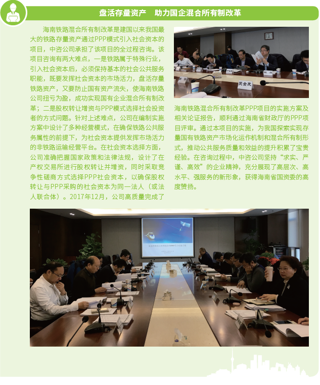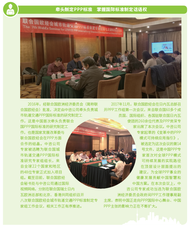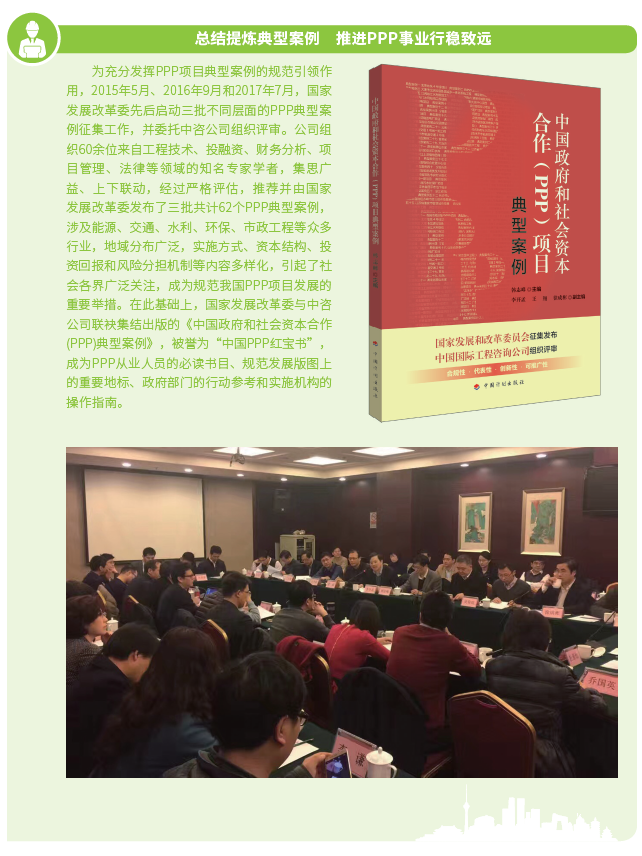 2016年以來,中咨公司緊緊圍繞“12445”發展戰略構想,鞏固提升五大業務支撐體系,積極探索開展政府和社會資本合作(以下簡稱PPP)咨詢等投資策劃業務,建立投融資平臺,尋找有價值的投資機會,實現資本與智本的融合,構建智力服務新業態,拓寬工程咨詢服務價值鏈。