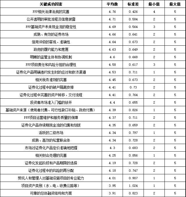導 讀 2017年4月,上海證券交易所舉行了中國首批PPP項目資產支持證券的掛牌儀式,標志著國家發展改革委、中國證監會聯合推進的傳統基礎設施領域PPP項目資產證券化(ABS)產品正式落地。 受國家發展改革委委托,中國國際工程咨詢有限公司(中咨公司)研究中心承擔了我國首批PPP資產證券化項目的評估以及相關專題的研究工作,其中“政府和社會資本合作項目資產證券化研究”專題成果獲2018年度國家發展改革委優秀研究成果三等獎。本文基于關鍵成功因素(CSF)分析,搭建關于PPP資產證券化融資的可行性評價模型,并在首批PPP資產證券化項目評估實踐中應用驗證,是該專題研究的系列成果之一。由哥倫比亞大學、清華大學、中咨公司等機構專家合作撰寫完成的相關學術論文Assessment Framework for Financing Public-Private Partnership Infrastructure Projects through Asset-Backed Securitization于2019年11月刊載于工程管理領域國際頂級學術期刊《Journal of Management in Engineering》(SCI檢索)第35卷第6期,本文基于原論文由伍迪、陸征翻譯整理,有刪減與修改。近期,恰逢國家發展改革委、中國證監會正在推動基礎設施REITs試點相關工作,基礎設施REITs即以權益型ABS產品穿透取得底層資產的公募基金,希望本文研究內容對相關從業人員及相關政策制訂提供一定參考與借鑒。 摘要:關鍵成功因素(Critical Success Factors,CSF)分析是PPP領域研究與實踐的一個重要分支,其重要意義在于可以為PPP從業者提供更為量化且易于操作的總體評價指標體系。PPP資產證券化能否取得預期效果受多方面因素的影響,為了探索如何成功地通過PPP資產證券化利用資本市場進行融資,有必要對其關鍵成功因素進行深入研究。本文首先綜合使用文獻調研、案例分析、專家訪談等方法,系統識別PPP資產證券化的關鍵成功因素清單,在此基礎上對相關領域專家展開廣泛的問卷調研;然后采用主成分分析法(Principal Component Analysis,PCA)處理調研數據,分析識別主成分與各因素之間的關系,從問卷數據中挖掘出市場認可的、對融資成功與否產生重要影響的幾個關鍵維度;最后基于以上結論搭建關于PPP資產證券化融資的可行性評價模型。 關鍵詞:政府與社會資本合作(PPP);資產證券化(ABS);關鍵成功因素(CSF);基礎設施融資;主成分分析(PCA) 1. PPP資產證券化關鍵成功因素的識別 1.1 基于文獻調研識別關鍵成功因素 在世界范圍內PPP與資產證券化的結合仍屬新生事物,2016年底中國發布專項政策推廣相關工作,國際上針對這一融資創新的理論研究十分有限。因此,本文對PPP關鍵成功因素、基礎設施融資、資產證券化等相關領域分別進行文獻調研,從中篩選并形成適合作為PPP資產證券化關鍵成功因素的初步清單,如表1所示。 表1 基于文獻調研識別的關鍵成功因素 1.2 基于案例分析識別關鍵成功因素 成功案例經驗歸納。以世界范圍內成功PPP項目為分析對象,重點從世界銀行發布的引入私人資本的優質PPP項目中篩選案例,歸納成功經驗,從而完善PPP項目資產證券化關鍵成功因素。案例分析的研究過程可以應用比較分析法來突顯這些成功項目的相似點,而這些相似點則可以作為這些成功項目的重要特征而添加到成功因素清單中。在與世界銀行融資方面相關專家訪談的基礎上,本文選定了來自6個國家的不同成功案例來進行比較分析。通過成功案例經驗歸納發現:政策支持、成熟有效的資本市場、采購過程的透明度、完善的法律框架、合理的項目審批流程、清晰的監管機構與公共部門實施機構、合理的風險分擔機制、實力強大的聯合體、清晰的職能與責任劃分、社會資本的融資能力、項目收費的合理定價、運營階段可靠的服務等是促成PPP項目成功的重要因素。 失敗案例教訓總結。對失敗案例教訓的總結能夠更加全面地了解PPP資產證券化融資的關鍵節點和成功的必要條件。本文選擇的失敗案例包括發生違約或信用評級降低等事件的基礎設施收費收益權類資產證券化案例,包括某大橋通行費收入收益權專項資產管理計劃(違約)、某熱電電力上網收費權債權和供用熱合同債權資產支持專項計劃(降級)等。通過對失敗的基礎設施資產證券化案例教訓總結發現:缺乏差額補償資金來源、提供擔保的機構與被擔保的項目具有強關聯性、產業政策的變化與市場的不確定性、現金流的歸集與分配結構不清晰、違約事件發生后缺乏解決方案等是導致失敗的重要因素。 1.3 基于專家訪談識別關鍵成功因素 在以上研究基礎上,研究團隊在2016年12月至2017年1月期間,對來自于政府監管機構、行業職能部門、機構投資者、金融中介機構、建筑工程公司、咨詢公司、科研機構等不同部門的共計36名資深專家進行專家訪談,以便進一步驗證和補充關鍵成功因素清單。訪談對象不僅來自于PPP資產證券化的各個相關行業,同時兼顧了政府和社會資本方、兼顧了業界從業者和學術界專家。 1.4 PPP資產證券化關鍵成功因素清單 通過文獻調研、案例分析、專家訪談三個步驟互相補充和驗證后,最終形成具有25項關鍵成功因素的清單,如表2所示。本研究將在此清單基礎上設計問卷并分析各因素的關系,為PPP資產證券化可行性分析奠定基礎。 表2 PPP資產證券化關鍵成功因素 2. 基于CSF清單的問卷調研設計與實施 2.1 問卷設計 本研究調研問卷基于以上識別出的關鍵成功因素(CSF)清單(表2)進行設