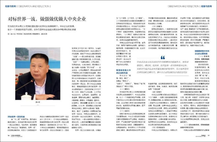 導讀 在當前百年未有之大變局的國際國內經濟社會發展格局下,中央企業的發展,處于一個關鍵的轉型節點期。競爭力是中央企業在長期競爭中取得優勢的關鍵。 ●對標世界一流的內涵 ●做強做優做大中央企業的內涵 ●做強做優做大中央企業的主要舉措 對標世界一流的內涵 自“十二五”時期開始,國內越來越多的部門、機構和學者開始關注世界一流企業的概念。與此同時,國資委明確了中央企業“做強做優,世界一流”的發展戰略目標,印發了《做強做優中央企業 培育具有國際競爭力世界一流企業》(2010年)、《中央企業做強做優、培育具有國際競爭力的世界一流企業要素指引》(國資發改革[2013]17號)、《中央企業做強做優、培育具有國際競爭力的世界一流企業對標指引》(國資發改革[2013]18號)等文件,為當時中央企業如何建設世界一流企業提供了行動指南,提出了中央企業建設要做到“四強”——自主創新能力強、資源配置能力強、風險管控能力強、人才隊伍強,“四優”——經營業績優、公司治理優、布局結構優、社會形象優。同時提出了著力培育一批具備“四個特征”——主業突出,公司治理良好;擁有自主知識產權的核心技術和國際知名品牌;具有較強的國際化經營能力和水平;在國際同行業中綜合指標處于先進水平,形象良好,有一定的影響力的具有國際競爭力的世界一流企業。在《中央企業做強做優、培育具有國際競爭力的世界一流企業要素指引》(國資發改革[2013]17號)文中,提出了公司治理、人才開發與企業文化、業務結構、自主研發、自主品牌、管理與商業模式、集團管控、風險管理、信息化、并購重組、國際化、社會責任、績效衡量與管理十三個方面的要素。2019年,國資委副主任翁杰明在講話中指出,按照中央要求的“做強、做優、做大”三者相統一的原則來打造世界一流企業,中央企業差距較大。在成為世界一流企業的過程中,至少要達到如下狀態,一是在創新驅動方面進入領先行列,二是在高質量發展方面能夠進入前列,三是在踐行新發展理念方面能夠進入前列。 世界一流企業的具體內涵,可概括為“三個領軍、三個領先、三個典型”。三個領軍是要成為在國際資源配置中占主導地位的領軍企業,引領全球行業技術發展的領軍企業,在全球產業發展中具有話語權和影響力的領軍企業。“三個領先”是指效率領先、效益領先和品質領先。“三個典范”是要成為踐行綠色發展理念的典范、履行社會責任的典范、全球知名品牌形象的典范。 中央企業還存在著大而不強、全而不優、散而不強等突出短板。盈利能力相對較弱、價值創造能力不強,企業在投資結構優化、發展質量提升等方面還有較大空間,建成世界一流企業仍需下決心加快解決存在的突出問題。 做強做優做大中央企業的內涵 中央企業“做強、做優、做大”,體現在“競爭力”,“創新力”,“控制力”,“影響力”和“抗風險能力”等五個方面。 (一)競爭力 在當前百年未有之大變局的國際國內經濟社會發展格局下,中央企業的發展,處于一個關鍵的轉型節點期。競爭力是中央企業在長期競爭中取得優勢的關鍵。企業的核心競爭力具有稀缺資源的特性,是其競爭對手難以模仿,且不可替代的獨特優勢。 (二)創新力 創新力是中央企業取得和保持競爭力的重要砝碼。中央企業最迫切的創新力提升應圍繞新興產業領域、關鍵核心技術、產業模式和產品創造力等四個層級進行創新能力建設,注重基礎研究、應用基礎研究、轉化研究三個方向的創新能力建設,推動形成具有世界先進水平的重大科技創新成果;重視體制機制改革、管理理念創新,以及企業家隊伍和創新型人才培育。 (三)控制力 國有經濟控制力,一是在對涉及國家安全和國民經濟命脈的重要行業和關鍵領域的控制,如礦藏等自然資源,航空航天等軍工產業,只能也必須由國有及國有控股大型企業承擔;二是對經濟運行態勢和發展趨勢的控制,國有經濟應代表國家利益。在推動經濟發展、重大科技創新,維護國家戰略安全和長遠利益等方面,應發揮頂梁柱作用,如打造好高鐵、核電、特高壓、高效清潔煤電等“中國名牌”。 (四)影響力 中央企業影響力的形成必須包含以下幾個要素:一是基于股權控制的影響力,即要融合發展,放大國有資本的功能。二是基于企業本身的影響力,即要壯大發展、聯合發展,發揮中央企業宏觀上支持經濟社會發展、微觀上帶動多種所有制企業發展的能力。三是基于中央企業承擔社會責任的影響力,由于中央企業具有獨特的地位與作用,在謀求企業發展的同時,必須積極履行政治責任、經濟責任以及社會責任,推動中央企業社會責任體系建設和全面發展。 (五)抗風險能力 中央企業的抗風險能力,體現在內外部兩個方面。首先是抵抗外部環境因素帶來的風險的能力,如經濟危機、國家政策變動等;其次是防范中央企業內部因素產生的風險的能力,涉及到技術、生產、管理、營銷等多個環節的潛在風險。面對目前較為復雜的國內外經濟社會環境,中央企業應積極預判和評估潛在風險,提前采取應對措施;補好經營風險防控的短板,抓牢日常監管,嚴防重大隱患;逐漸退出產能過剩產業、高污染高耗能產業、高度市場化行業等。 做強做優做大中央企業的主要舉措 (一)堅持黨的領導,凝聚做強做優做大的
