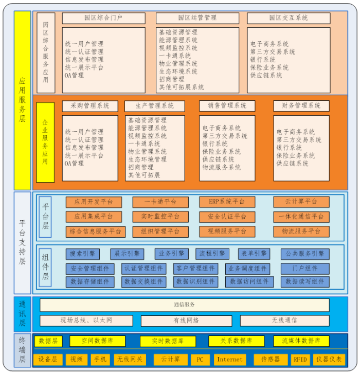 面向新材料產業園的智慧管理系統研究 王瑞江 朱曉霞 張莉莉 夏艷麗 摘要: 產業園區是區域經濟發展、城市可持續健康發展、產業轉型升級的重要集聚區。而園區信息化建設是產業園發展的重要支撐部分,又是區域經濟發展、城市建設發展的新主題與新動力,創建以智能技術為支撐的生態、高效的智慧園區是未來的趨勢。本文就以新材料產業園規劃建設為基礎,明確其建設目標和需求,提出新材料產業園智慧管理系統,設計了系統總體架構、技術架構以及各功能模塊,并對各功能模塊進行詳細闡述,力求為新興產業園區的智能化、信息化、數字化建設提供一些參考。 關鍵詞: 新材料產業園; 智能管理; 系統設計; ERP系統 產業園作為區域經濟發展的助推器,是區域經濟與產業聯動的橋梁,是對外開放、招商引資、管理創新的主要載體,是產業集聚、企業協作、生態資源共享的活力平臺[1]。早期,我國產業園區多以硬環境建設為主,受制于財力、技術和知識的局限,很少涉及智能化軟實力建設,信息化、智能化均由園區企業自行完成。同時,產業園區規劃仍存在重復性建設、同質化和惡性競爭等問題[2]。隨著信息技術迅猛發展與深入應用,給產業園區轉型發展帶來了新活力,引領各類園區朝著集聚化、規范化、綠色生態化、智能化發展。同時,國家高度重視園區的轉型升級和高質量發展,要求加強園區信息化基礎建設,鼓勵園區采用物聯網、云計算、大數據、人工智能、新一代移動寬帶網等現代信息技術,建立智慧化公共服務平臺[3]。可見,信息化、智能化是未來產業園區發展的趨勢,是國家政策的導向。 在新時代背景下,互聯網、大數據、云計算及人工智能等新一代信息技術與產業深度融合,推進產業智能化、專業化、數字化轉型,實現轉型發展,是所有產業面臨的新課題。新一輪信息技術業已滲透到經濟社會各領域,包括企業、園區各層面,通過信息化建設,可以營造優質的產業發展和服務環境[4]。全面運用信息化促進產業轉型升級、可持續發展,提高園區管理與服務水平,是增強園區吸引力的重要手段[5]。隨著新一代信息技術的快速發展和深度應用,助推了其與園區、行業以及實體經濟深度融合,實現了園區建設的智慧化。利用信息化技術搭建園區公共服務平臺,實現園區安全管理、環保管理、交通管理、監控管理以及其他輔助管理等方面的管理功能。 本文以新材料產業園信息化建設為面向對象,明確建設目標和需求,利用新一代信息技術對其智能管理系統(IMS) 開展設計,主要內容包括系統總體架構、技術架構以及各功能模塊,并對各功能模塊進行詳細闡述,力求為新興產業園區的智能化、信息化、數字化建設提供一些參考。 一、智能管理系統設計需求與目標 (一)系統設計需求 新材料園區對信息化的需求主要集中在三個方面: 一是基礎網絡覆蓋,二是園區管理信息化,三是溝通信息化。運用現代計算機技術、現代通信技術、現代自動化控制技術、現代可視化技術、ERP技術以及系統集成技術等現代信息技術,在滿足管理規范、生產安全、人文社會和諧的需求前提下,打造一個面向產業園,融合管理、運營和服務,產業化、信息化、數字化為一體的智能管理平臺,有助于園區規劃信息化建設和管理服務,營造一個安全、便捷、高效的園區企業信息化應用環境,提升企業的管理水平、產品競爭水平、研發創新力以及信息化水平,促進園區企業的轉型升級,園區產業可持續高質量發展。 (二)系統設計目標 新材料產業園IMS設計總體目標是打造集中統一的信息化管理平臺,引入蘊含先進管理理念的成熟軟件,帶動產業園向現代企業管理制度轉型,實現管理決策的智能化、信息化和數字化。同時, IMS實現入駐企業在財務、銷售、生產、庫存、采購等方面的管控智能化,實現生產經營決策的科學化,實現“產銷一體、管控有序、三流同步”,最終,實現產業園綜合服務管理的智慧化。 二、智能管理系統設計方案 (一)系統設計原則 新材料產業園IMS在規劃設計中,既要體現安全可靠性和易用性,又要充分體現系統的先進性和前瞻性,避免日后上線就落后,補救升級擴容的現象。因此, IMS規劃設計應遵循以下設計原則: (1) 先進性原則。IMS所采用的信息技術是目前比較先進的且能夠持續很長一段時間。IMS的架構、技術和功能也是新穎和先進的,能夠保證新材料產業園運營管理平臺系統的先進性。(2) 前瞻性原則。充分考慮新材料產業園的未來趨勢和需求, IMS既要滿足近期實際需求,又要滿足未來十年園區的發展需求,還要支持未來新材料產業規模擴大的需要。(3) 可靠性原則。IMS在原型設計時,采用了成熟的技術,精心考慮了未來信息技術的發展趨勢,確保其可靠性、穩定性。本文所設計的IMS,切實契合新材料產業園的可持續發展需要。(4) 安全性原則。本文在IMS設計時,采用了多系統容錯機制和先進的計算機防控技術,同時也采用了硬件防火墻,隔離非法訪問,確保系統信息資源的安全性,避免出現園區管理上的漏洞。(5) 易用性原則。在IMS的設計中,充分考慮了系統整體架構的可理解性,系統界面人性化簡單易用,功能完整使用方面,切實體現管理的便利性。 (二)總體技術架構 新材料產業園IMS是由多個子系統構成互聯互通的整體系統,總體技術架構主要分為終端層、通信傳輸層、平臺支持層