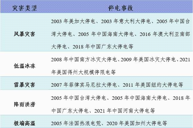 電力系統應對極端天氣自然災害存在的薄弱環節及對策建議 梁雙 嚴超 王涉 王程 摘要:近年來,全球范圍內極端天氣自然災害引發的突發性大面積停電事故頻發,帶來巨大的經濟損失和嚴重的社會影響。伴隨全球氣候變化,傳統意義上的“幾十年一遇”“百年一遇”的極端天氣變得更加頻繁、更加劇烈。在碳達峰碳中和背景下,以新能源為主體的新型電力系統呈現出更強的“天氣耦合性”和“系統脆弱性”,供電安全面臨前所未有的風險挑戰,亟需轉變思路、統籌謀劃,從設計標準、應急手段、預警系統和協同機制等方面全面提升電力系統的應急保供能力。 一、引言 近年來,溫室氣體排放導致全球氣候和環境變化加劇,洪澇、颶風、雷暴、寒潮和高溫等極端天氣自然災害事件(圖1)的發生頻率增加。根據環境智庫德國觀察(Germanwatch)發布的《全球氣候風險指數2021》[1],我國氣候風險指數全球排名第32位,受極端天氣自然災害事件影響導致的經濟損失全球排名第4位。中國氣象局氣候變化中心發布的《中國氣候變化藍皮書(2021)》[2]顯示,我國是全球氣候變化的敏感區和影響顯著區,升溫速率明顯高于同期全球平均水平;高溫、強降水等極端天氣事件增多增強,氣候風險水平趨于上升。1991-2020年,中國氣候風險指數平均值(6.8)較1961-1990年平均值(4.3)增加了58%。可見,我國面臨極端天氣自然災害事件的頻率和風險不斷升高。 極端天氣自然災害通常會對電力基礎設施帶來不利影響,嚴重情況下甚至威脅供電安全。比如,極端高溫天氣情況下,用電負荷劇增,“極熱無風”導致風電機組出力遠低預期,引發電力供應短缺;極端寒潮天氣導致輸電線路、風電機組覆冰倒塌;洪澇災害導致變電站、輸電桿塔、調度通信等關鍵電力設施損毀,影響正常供電。碳達峰碳中和背景下,以新能源為主體的新型電力系統,將呈現出更強的“天氣耦合性”和“系統脆弱性”[3],供電安全面臨前所未有的風險挑戰,亟需轉變思路、統籌謀劃,從設計標準、應急手段、預警系統和協同機制等方面全面提升電力系統的應急保供能力。 二、極端天氣自然災害對供電安全的影響 (一)極端天氣自然災害對傳統電力系統的影響 極端天氣自然災害通常會從兩個方面對傳統電力系統供電安全產生影響。一方面,極端天氣導致電力負荷激增,如2020年美國加州大停電由極端高溫引起空調負荷劇增所致,而2021年美國得州大停電與極端寒潮引起取暖負荷劇增密切相關;另一方面,極端天氣導致發電廠、輸電線路、用電設備等設施損壞,如2021年7月我國河南大停電,“百年一遇”強降雨導致500余條線路、9座變電站損毀,1100余個居民區長時間停電。 (二)極端天氣自然災害對新型電力系統的影響 新型電力系統中風電、光伏等新能源發電占比不斷提高,新能源發電的天氣強耦合性、運行弱支撐性帶來了三方面的運行風險: 首先,對傳統電力系統影響較小的無風、陰雨、沙塵天氣,將阻礙新能源出力,導致電源不足,事故風險點大幅增加。以2021年7月28日東北電網為例,用電負荷高達7058萬千瓦,同比增長8.2%;而“極熱無風”導致風電出力僅3.4萬千瓦,不足風電裝機容量4026萬千瓦的0.1%,電力缺口超過800萬千瓦。 其次,對傳統電力系統輸配電設施和用電需求影響較大、但對發電機組影響較小的臺風、暴雨、寒潮、冰災天氣,也將阻礙新能源出力,導致網絡傳輸受阻、用電負荷激增疊加電源不足,事故影響面明顯擴大。比如,2016年澳大利亞南部大停電就是由強臺風誘發風電機組大規模脫網導致的,而2021年美國得州大停電,與寒潮導致部分風機故障、風電出力下降密切相關。 此外,煤電、氣電等強支撐性電源減少,風電、光伏等弱支撐性電源增加,導致電力系統抵御風險能力下降,事故連鎖鏈顯著延長。比如,2021年得州大停電,電網中新能源占比較高,系統支撐電源和備用電源明顯不足[4],無法平衡負荷激增、風電和氣電出力下降產生的電力缺口和運行擾動,導致大面積拉閘限電。 (三)極端天氣自然災害引發的典型停電事故 極端天氣自然災害事件的發生頻率不高,但其導致的故障占電力系統故障的比例很高。據統計,全球80%以上的停電事故由臺風、暴雨、寒潮、冰災和地震等極端天氣自然災害引發,每年造成的直接經濟損失超過300億美元,且呈逐年上升趨勢。 表1 極端天氣停電事故按類型統計表[5] 1.2016年澳大利亞南部大停電 2016年9月28日下午,一股強臺風伴隨暴風雨、閃電、冰雹襲擊了澳大利亞南部地區,輸電線路故障引發電壓跌落,風電機組因低電壓穿越能力不足大規模脫網。澳大利亞南部地區電網網架結構薄弱,僅通過兩條聯絡線與東側維多利亞州聯接。風電機組脫網后,導致大規模潮流轉移,聯絡線因嚴重過載而跳閘,澳大利亞南部電網成為孤立電網。進而,因其有功功率和無功功率的缺失,引發系統頻率和電壓的崩潰,最終導致該地區大停電,而隨后的黑啟動失敗導致澳大利亞南部地區長達50小時的大停電。 2.2019年英國大停電 2019年8月9日下午5點左右,英國發生大規模停電事故。事故發生前,英格蘭與威爾士電網的總負荷約2535萬千瓦。位于貝德福德郡的Little Barford燃氣電站出力73萬千瓦,占全網總負荷的2.88%,風電總出力約為880萬千瓦,占全網總負荷的34.71%。Little Barford燃氣電站突然停機,系統頻率下降,霍恩海的海上風電風機大量脫網,出力突