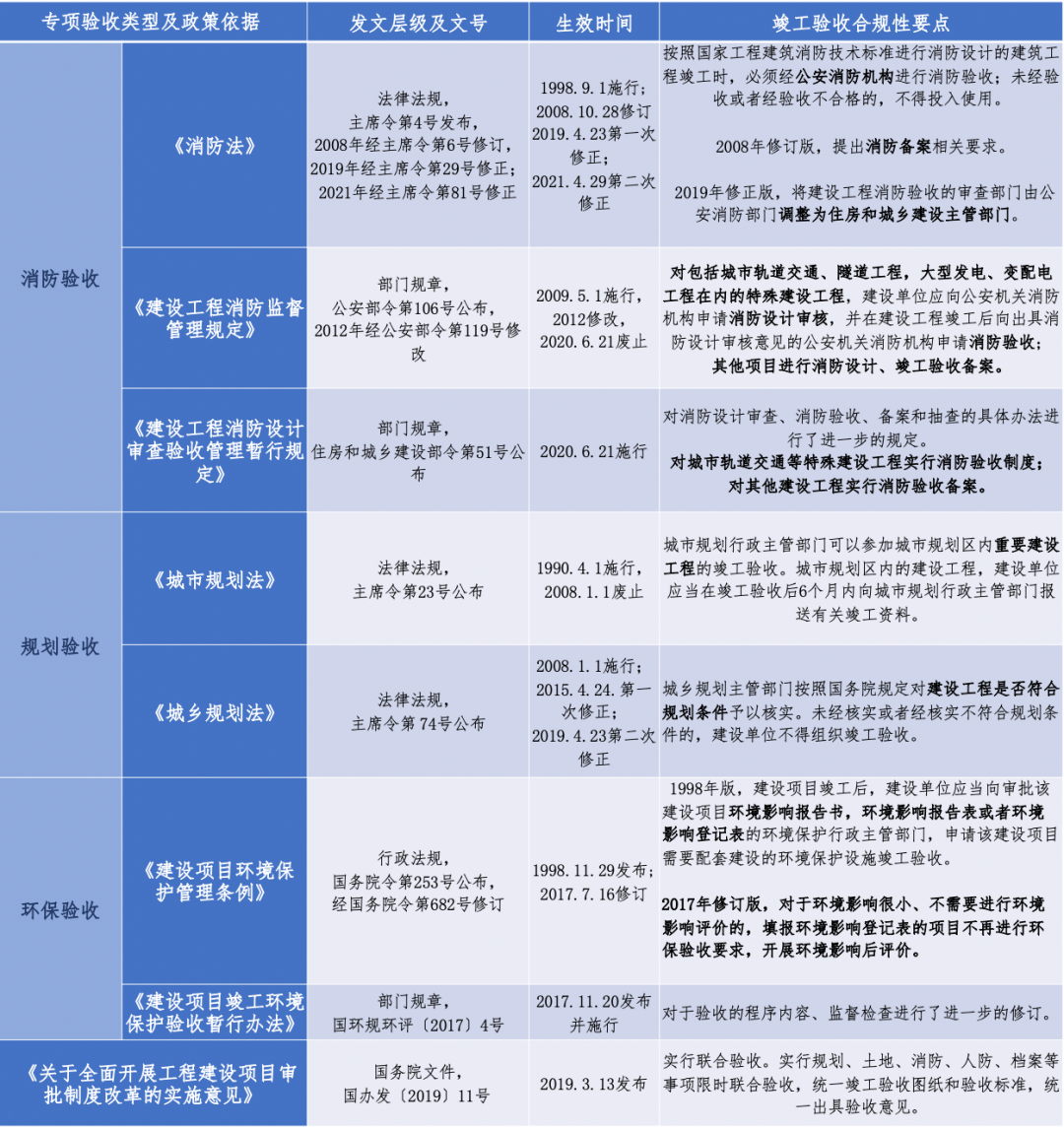 編者按 新中國成立以來,我國基礎設施投資建設取得了舉世矚目的成就,是國家經濟社會發展的重要支撐,為人民生活水平的提高做出了巨大貢獻。改革開放以來,市場開始發揮配置資源的決定性作用,為我國基礎設施的發展煥發了新的活力。據統計,我國基礎設施資產總規模在1990年排在全世界約第15位,2000年上升到第7位,2010年躍升為第3位,至2018年已居世界首位。 黨的二十大報告在回顧過去五年的工作和新時代十年的偉大變革中,充分肯定了基礎設施在經濟社會中發揮的重要作用。報告指出,我國“建成世界最大的高速鐵路網、高速公路網,機場港口、水利、能源、信息等基礎設施建設取得重大成就”。我國基礎設施多年來大規模的投資建設和存量資產的高速積累,是黨中央、國務院在建立社會主義市場經濟體制背景下,關于投融資體制改革部署的重要成果。 項目前期工作手續的合規性要求,是基礎設施能夠發揮其應有價值的重要前提,也是投融資體制改革關注的重點內容之一。伴隨著政府職能轉變、深化“放管服”改革和擴大有效投資等重大決策的關鍵部署,我國工程建設項目審批制度不斷優化和改革,基礎設施項目投資前期決策管理經歷了復雜的演變進程,其合規性標準也在與時俱進、不斷完善。當前我國已進入基礎設施存量時代,存量資產項目前期工作手續的合規性是重要的盤活條件之一,部分合規性問題已成為新時代社會廣泛關注的焦點。本項專題研究立足投融資體制和項目審批制度變革的歷史背景,嘗試厘清基礎設施項目在立項、土地、規劃、環境、建設施工等方面主要前期工作的歷史變革脈絡,梳理不同管理事項之間的邏輯關聯,從這一視角提供基礎設施項目前期工作手續的合規性認識。本公眾號將研究報告的部分成果以系列文章的形式陸續刊發,研究報告第一部分為背景與立項篇,第二部分為土地與規劃篇,本文是系列研究報告的第三部分(建設施工篇),供業界同仁參考。 基礎設施項目前期工作手續合規性研究(Ⅲ) 張雪飛 伍迪 摘要:開工和竣工是基礎設施項目建設施工方面的重要工作節點,依法合規開展有關工作是項目的合規性前提。建筑工程施工許可證(或開工報告)是建筑施工單位符合施工條件、允許開工的批準文件,是建設單位進行工程施工的法律憑證,是工程項目由實施準備轉向施工建設、由藍圖設計變成項目實體的重要工作手續。竣工驗收是建設工程項目竣工后,全面考核建設工作、檢查是否符合設計要求和工程質量的重要環節,是工程項目由施工建設走向運營投產,是建設投資成果轉入交付使用的關鍵工作事項。本文聚焦基礎設施項目建設施工方面的手續,尤其對施工許可和竣工驗收兩方面的主要內容和制度演進進行系統梳理,供業界參考。 關鍵詞:基礎設施;合規性;施工許可;竣工驗收;政策演進 一、施工許可手續合規性 (一)內涵與適用范圍 建筑工程施工許可證是建筑施工單位符合施工條件、允許開工的批準文件,是建設單位進行工程施工的法律憑證。根據有關法律政策規定,在中華人民共和國境內從事各類房屋建筑及其附屬設施的建造、裝修裝飾和與其配套的線路、管道、設備的安裝,以及城鎮市政基礎設施工程的施工,建設單位在開工前應當向工程所在地縣級以上人民政府建設行政主管部門申請領取施工許可證,國務院建設行政主管部門確定的限額以下的小型工程除外。具體而言,對于工程投資額在30萬元以下或者建筑面積在300平方米以下的建筑工程,可以不申請辦理施工許可證。各省、自治區、直轄市人民政府住房城鄉建設主管部門可以根據當地的實際情況,對限額進行調整,并報國務院住房城鄉建設主管部門備案。按照國務院規定的權限和程序批準開工報告的建筑工程,不再領取施工許可證。 辦理施工許可證有關事項應主要以《中華人民共和國建筑法》(以下簡稱《建筑法》)和《建筑工程施工許可管理辦法》等法規政策為依據。根據最新修訂且現行有效的2019年版《建筑法》和2021年版《建筑工程施工許可管理辦法》,申請領取施工許可證,應當符合的條件包括:(1)依法應當辦理用地批準手續的,已經辦理該建筑工程用地批準手續;(2)依法應當辦理建設工程規劃許可證的,已經取得建設工程規劃許可證;(3)施工場地已經基本具備施工條件,需要征收房屋的,其拆遷進度符合施工要求;(4)已經確定建筑施工企業;(5)有滿足施工需要的資金安排、施工圖紙及技術資料,其中施工圖設計文件已按規定審查合格;(6)有保證工程質量和安全的具體措施。 施工許可證的時效方面,根據有關規定,建設單位應當自領取施工許可證之日起3個月內開工。因故不能按期開工的,應當向發證機關申請延期;延期以兩次為限,每次不超過3個月。既不開工又不申請延期或者超過延期時限的,施工許可證自行廢止。在建的建筑工程因故中止施工的,建設單位應當自中止施工之日起1個月內,向發證機關報告,并按照規定做好建筑工程的維護管理工作。建筑工程恢復施工時,應當向發證機關報告;中止施工滿1年的工程恢復施工前,建設單位應當報發證機關核驗施工許可證。按照國務院有關規定批準開工報告的建筑工程,因故不能按期開工或者中止施工的,應當及時向批準機關報告情況。因故不能按期開工超過6個月的,應當重新辦理開工報告的批準手續。 (