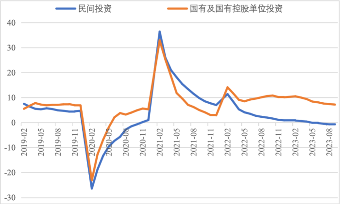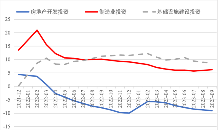2023年前三季度,我國(guó)經(jīng)濟(jì)運(yùn)行持續(xù)恢復(fù)向好,投資對(duì)優(yōu)化供給結(jié)構(gòu)的關(guān)鍵作用顯著增強(qiáng),高技術(shù)產(chǎn)業(yè)投資保持較快增長(zhǎng),基礎(chǔ)設(shè)施投資、制造業(yè)投資穩(wěn)投資支撐作用進(jìn)一步發(fā)揮。同時(shí),當(dāng)前穩(wěn)投資也面臨新的困難挑戰(zhàn),尤其是房地產(chǎn)市場(chǎng)深度調(diào)整導(dǎo)致房地產(chǎn)開(kāi)發(fā)投資和民間投資承受較大下行壓力。下一步仍需精準(zhǔn)有力加強(qiáng)逆周期調(diào)控,不斷拓展促投資政策空間,重點(diǎn)圍繞提振房地產(chǎn)市場(chǎng)、推動(dòng)制造業(yè)轉(zhuǎn)型升級(jí)、激發(fā)民間投資活力等方面,繼續(xù)夯實(shí)投資復(fù)蘇基礎(chǔ)。 一、固定資產(chǎn)投資整體運(yùn)行情況 (一)整體投資保持平穩(wěn)增長(zhǎng)態(tài)勢(shì) 2023年1—9月,我國(guó)固定資產(chǎn)投資(不含農(nóng)戶,下同)375035億元,同比增長(zhǎng)3.1%,較國(guó)內(nèi)生產(chǎn)總值增速低了2.1個(gè)百分點(diǎn),較上半年增速低了0.7個(gè)百分點(diǎn),固定資產(chǎn)投資增速持續(xù)放緩。從投資構(gòu)成看,上半年建安工程、設(shè)備工器具購(gòu)置、其他費(fèi)用分別增長(zhǎng)2.4%、6.8%、3.1%。設(shè)備工器具購(gòu)置保持較快增長(zhǎng),反映在各類政策工具支持引導(dǎo)下,企業(yè)設(shè)備購(gòu)置、技術(shù)改造投入力度加大。 圖1 全國(guó)固定資產(chǎn)投資增速(%) 數(shù)據(jù)來(lái)源:國(guó)家統(tǒng)計(jì)局 (二)民間投資意愿和能力仍待恢復(fù) 2023年1—9月,民間固定資產(chǎn)投資為193399億元,同比下降0.6%,較上半年低了0.4個(gè)百分點(diǎn),低于投資整體增速3.7個(gè)百分點(diǎn)。從季度波動(dòng)看,民間固定資產(chǎn)投資的增速由2022年第一季度的8.4%持續(xù)下滑,并連續(xù)兩個(gè)季度負(fù)增長(zhǎng)。民間固定資產(chǎn)投資占比進(jìn)一步萎縮,跌至2011年以來(lái)的最低點(diǎn),僅為51.57%。 圖2 民間投資增速及占比(%) 數(shù)據(jù)來(lái)源:國(guó)家統(tǒng)計(jì)局,Wind數(shù)據(jù)庫(kù) 國(guó)家統(tǒng)計(jì)局發(fā)布信息顯示,房地產(chǎn)投資中約80%為民間投資。受房地產(chǎn)市場(chǎng)深度調(diào)整影響,民間投資動(dòng)力和能力相對(duì)不足,國(guó)有及國(guó)有控股單位投資增速連續(xù)20個(gè)月高于民間投資增速。2023年1—9月,國(guó)有及國(guó)有控股單位同比增長(zhǎng)7.2%,較民間投資增速高了7.8個(gè)百分點(diǎn)。 圖3 民間投資、國(guó)有及國(guó)有控股單位投資增速(%) 數(shù)據(jù)來(lái)源:國(guó)家統(tǒng)計(jì)局,Wind數(shù)據(jù)庫(kù) (三)制造業(yè)投資保持較快增長(zhǎng),基礎(chǔ)設(shè)施補(bǔ)短板投入加大 2023年1—9月,制造業(yè)和基建投資保持較快增長(zhǎng),房地產(chǎn)投資持續(xù)負(fù)增長(zhǎng),且降幅有所擴(kuò)大。基礎(chǔ)設(shè)施投資在專項(xiàng)債等融資支持政策以及重大項(xiàng)目支撐下,效果持續(xù)顯現(xiàn),前三季度基礎(chǔ)設(shè)施投資同比增長(zhǎng)8.64%,高于全部投資5.54個(gè)百分點(diǎn),是三大類投資中增長(zhǎng)最快的領(lǐng)域。其中,鐵路運(yùn)輸業(yè)、倉(cāng)儲(chǔ)業(yè)投資分別大幅增長(zhǎng)22.1%、27.7%。截至9月底,新增地方政府專項(xiàng)債已發(fā)行超過(guò)3.1萬(wàn)億元,完成全年專項(xiàng)債額度的80%以上,對(duì)基礎(chǔ)設(shè)施投資形成較強(qiáng)支撐。1—9月份,計(jì)劃總投資億元及以上項(xiàng)目投資同比增長(zhǎng)10.2%,較1—8月快了0.3個(gè)百分點(diǎn),對(duì)全部投資增長(zhǎng)的貢獻(xiàn)率達(dá)169.2%,大項(xiàng)目投資帶動(dòng)作用明顯。 數(shù)據(jù)來(lái)源:國(guó)家統(tǒng)計(jì)局,Wind數(shù)據(jù)庫(kù) 2023年1—9月,制造業(yè)投資同比增長(zhǎng)6.2%,比整體投資高3.1個(gè)百分點(diǎn)。其中,高技術(shù)制造業(yè)投資同比增長(zhǎng)11.3%,對(duì)制造業(yè)投資拉動(dòng)作用明顯,表明我國(guó)制造業(yè)加速轉(zhuǎn)型升級(jí)。9月,制造業(yè)采購(gòu)經(jīng)理指數(shù)(PMI)為50.2%,比上月上升0.5個(gè)百分點(diǎn),重返擴(kuò)張區(qū)間。生產(chǎn)指數(shù)和新訂單指數(shù)均高于臨界點(diǎn),分別為52.7%和50.5%,表明制造業(yè)生產(chǎn)和市場(chǎng)需求穩(wěn)步回升。裝備制造業(yè)、高技術(shù)制造業(yè)PMI分別為50.6%、50.1%,均位于擴(kuò)張區(qū)間。從企業(yè)規(guī)模看,大、中、小型企業(yè)PMI分別為51.6%、49.6%和48%,其中大型企業(yè)PMI較上月回升0.8個(gè)百分點(diǎn),為近6個(gè)月高點(diǎn),表現(xiàn)出強(qiáng)勁恢復(fù)發(fā)展動(dòng)能。 圖4:制造業(yè)PMI指數(shù)(%) 數(shù)據(jù)來(lái)源:國(guó)家統(tǒng)計(jì)局,Wind數(shù)據(jù)庫(kù) 2023年1—9月,房地產(chǎn)開(kāi)發(fā)投資增速持續(xù)放緩,房地產(chǎn)開(kāi)發(fā)投資、住宅開(kāi)發(fā)投資分別同比下降9.1%、8.4%。房地產(chǎn)開(kāi)發(fā)投資占固定資產(chǎn)投資完成額的比重降至23.3%,較上半年下降0.8個(gè)百分點(diǎn),為今年以來(lái)最低值。房屋施工面積、房屋新開(kāi)工面積等先行指標(biāo)均出現(xiàn)明顯下滑,分別同比下降7.1%、23.4%。1—9月,國(guó)房景氣指數(shù)均位于100以下,自4月以來(lái)持續(xù)