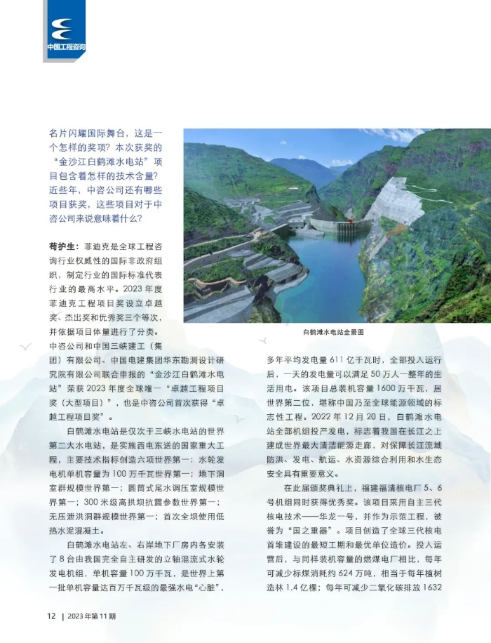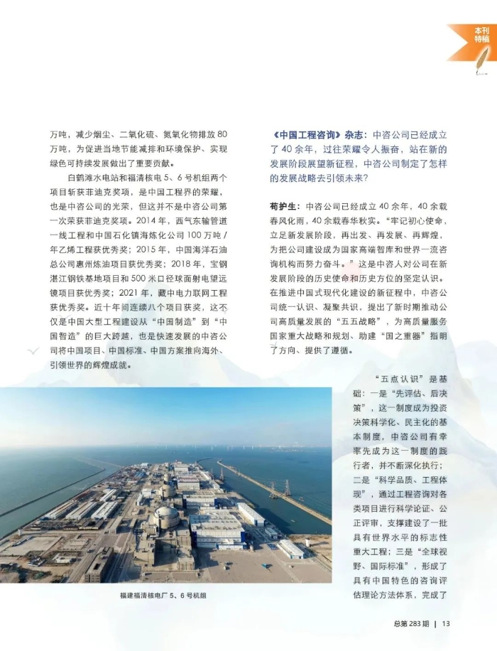 喜訊再度傳來!今年的金秋九月,在新加坡舉辦的菲迪克“2023年全球基礎設施獎”頒獎典禮上,中國國際工程咨詢有限公司(以下簡稱中咨公司)再次榮獲“菲迪克工程項目獎”,并捧得全球大型項目領域唯一的“卓越工程項目獎”。這是對中咨公司在工程咨詢領域杰出貢獻的認可,也證明了中咨公司在全球工程咨詢行業中的領先地位和專業水平。 中咨公司成立于1982年,是國家高端智庫和首屈一指的綜合性工程咨詢機構,也是國家投資建設領域決策科學化、民主化的見證者、先行者、踐行者。自成立以來,中咨公司始終以高質量咨詢成果服務“國之大者”、助建“國之重器”,高質量服務共建“一帶一路”,在國家經濟社會發展中發揮著獨特的參謀助手作用。近日,《中國工程咨詢》雜志專訪了中國國際工程咨詢有限公司黨委書記、董事長、總經理茍護生,分享了中咨公司在服務國家重大戰略、重大規劃、重大項目背后的故事,講述中咨公司“服務國家、貢獻社會”的初心使命。 《中國工程咨詢》雜志:作為一家國家級高端智庫,中咨公司是如何高質量服務國家重大戰略規劃的?具體開展了哪些項目? 茍護生:長期以來,中咨公司承擔中央政府委托的一系列重大咨詢和研究任務,在重大工程、區域規劃、產業政策等關系國計民生的領域發揮著重要的智囊團作用。2022年6月,經中央批準,中咨公司正式成為國家高端智庫建設培育單位,也是唯一一家整體納入國家高端智庫的中央企業。我們的智庫建設主要圍繞經濟社會發展、國防科技工業、“一帶一路”三大領域做精做深,逐步形成中咨特色。目前,已累計向黨中央、國務院報送700余篇政策咨詢報告,多篇獲中央領導同志的重要批示,決策咨詢刊物《中咨專報信息》已形成品牌。近年來,多次受到中央有關單位的表揚和肯定。 近年來,我們完成了長江經濟帶生態環境整治評估,承擔了雅魯藏布江中上游生態修復與保護、新安江—千島湖生態補償試驗區建設等咨詢論證任務;承擔國家“十四五”規劃中的重大工程中期評估、長江經濟帶發展規劃綱要評估、粵港澳大灣區發展規劃綱要實施情況評估、長三角一體化和黃河流域高質量發展重大項目咨詢、中央企業戰略性新興產業布局研究等重大任務;我們積極響應黨中央碳達峰、碳中和戰略部署,深度參與國家“雙碳”“1+N”政策體系研究和資源環境立法工作。 過去亮眼的成績不是終點,而是新的起點,中咨人始終將推進國家高端智庫建設、以智報國作為自己矢志不渝的追求,不斷超越自我,開拓創新,為中國式現代化建設貢獻中咨智慧。 《中國工程咨詢》雜志:在建設“一帶一路”的過程中,作為“走出去”的積極踐行者,中咨公司如何深入落實這一國家倡議?具體實踐有哪些? 茍護生:今年是“一帶一路”倡議提出十周年,也是中咨公司積極參與沿線國際商事活動、以咨詢服務為基建工程保駕護航的十周年。2013年以來,中咨公司積極響應習近平總書記提出的“一帶一路”倡議,圍繞“一帶一路”產業布局、產能合作、基礎設施建設等領域積極開展政策咨詢,參與起草了“一帶一路”相關管理辦法、境外合作園區確認考核管理辦法等文件,開展了“一帶一路”基礎設施合作高質量發展、中非基礎設施合作規劃、境外經貿合作區高質量發展評價等一系列專題研究工作。在“一帶一路”的發展歷程中,從政策研究、規劃編制到境外產業園區建設、重大項目評估,再到項目建設管理,都閃耀著具有中國特色的中咨力量。 中咨公司圍繞新時期高水平對外開放,為高質量推進“一帶一路”建設提供全方位咨詢服務:承擔了埃塞北部鐵路、喀麥隆水廠等項目全過程咨詢;完成了玻利維亞煉廠優惠貸款項目現場考察和綜合評估;承擔的援柬埔寨交通領域總體規劃項目順利完成并移交,得到柬方高度評價;完成了“沙特大陸橋”階段性評估;克服艱難險阻,完成中老鐵路監理任務;中老鐵路搬遷安居村項目獲得中國援外項目“優良”工程評定;中印尼“兩國雙園”項目為兩國貿易打造了“一帶一路”經貿往來的大通道、產業合作的連通器、民心相通的新載體……在共建“一帶一路”的征程上,中咨人的腳步從未停下,從規劃、評估、咨詢、監理到全過程咨詢,每一步都緊跟國家戰略方向。下一個十年里,中咨人將更加奮發作為,為高質量共建人類命運共同體作出新貢獻。 問:如今,在不少重大工程中常常能見到中咨公司的身影,作為歷史發展的見證者,中咨公司如何高質量投身國家重大工程建設? 茍護生:習近平總書記指出,“中國經濟社會快速發展,其中工程科技創新驅動功不可沒”,“三峽工程、西氣東輸、西電東送、南水北調、青藏鐵路、高速鐵路等一大批重大工程建設成功,大幅度提升了中國的基礎工業、制造業、新興產業等領域創新能力和水平,加快了中國現代化進程”。重大工程是落實國家戰略意圖、實現國家發展目標的重要抓手,是保障和促進經濟發展的“壓艙石”,是名副其實的“國之重器”。中咨公司承擔了改革開放以來幾乎所有國家重大工程項目的咨詢評估任務,是歷史的親歷者、更是國家發展的參與者。 多年來,中咨公司完成了南水北調、川藏鐵路、白鶴灘—浙江特高壓輸電、西氣東輸四線引江補漢、三峽水運新通道、藏東南至粵港澳輸電通道、川氣東送二線、載人