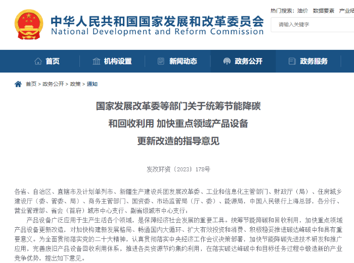 擴(kuò)大產(chǎn)品設(shè)備更新改造有效需求 推動(dòng)制造業(yè)高品質(zhì)供給 助力實(shí)體經(jīng)濟(jì)高質(zhì)量發(fā)展 ——《關(guān)于統(tǒng)籌節(jié)能降碳和回收利用 加快重點(diǎn)領(lǐng)域產(chǎn)品設(shè)備更新改造的指導(dǎo)意見》解讀 中國國際工程咨詢有限公司 潘小海 產(chǎn)品設(shè)備作為日常生產(chǎn)生活中不可或缺的工具,是保障經(jīng)濟(jì)社會發(fā)展的重要基礎(chǔ),具有應(yīng)用范圍廣、保有量大、能耗量高、再生資源蘊(yùn)藏豐富等特點(diǎn)。近日,國家發(fā)展改革委等9部門聯(lián)合印發(fā)了《關(guān)于統(tǒng)籌節(jié)能降碳和回收利用 加快重點(diǎn)領(lǐng)域產(chǎn)品設(shè)備更新改造的指導(dǎo)意見》(發(fā)改環(huán)資〔2023〕178號,以下簡稱《指導(dǎo)意見》),對相關(guān)工作進(jìn)行部署,明確了總體要求、工作目標(biāo)和重點(diǎn)任務(wù),有利于暢通國內(nèi)大循環(huán)、加快發(fā)展方式綠色轉(zhuǎn)型、積極穩(wěn)妥推進(jìn)碳達(dá)峰碳中和、助推經(jīng)濟(jì)社會高質(zhì)量發(fā)展。 01 加快產(chǎn)品設(shè)備更新改造和回收利用是暢通國內(nèi)大循環(huán)的重要手段 加快構(gòu)建以國內(nèi)大循環(huán)為主體、國內(nèi)國際雙循環(huán)相互促進(jìn)的新發(fā)展格局,是以習(xí)近平同志為核心的黨中央作出的重大戰(zhàn)略決策。去年底召開的中央經(jīng)濟(jì)工作會議將著力擴(kuò)大內(nèi)需放在2023年重點(diǎn)工作任務(wù)首位。近期,習(xí)近平總書記在中央政治局第二次集體學(xué)習(xí)時(shí)強(qiáng)調(diào),要搞好統(tǒng)籌擴(kuò)大內(nèi)需和深化供給側(cè)結(jié)構(gòu)性改革,形成需求牽引供給、供給創(chuàng)造需求的更高水平動(dòng)態(tài)平衡,實(shí)現(xiàn)國民經(jīng)濟(jì)良性循環(huán)。 從經(jīng)濟(jì)發(fā)展規(guī)律來看,大國經(jīng)濟(jì)具有內(nèi)需為主導(dǎo)的顯著特征。我國市場上的產(chǎn)品設(shè)備種類多、應(yīng)用范圍廣,對促進(jìn)國內(nèi)消費(fèi)、帶動(dòng)經(jīng)濟(jì)增長具有重要作用,是實(shí)施擴(kuò)大內(nèi)需戰(zhàn)略的重要著力點(diǎn)。僅以家用電器為例,有關(guān)行業(yè)協(xié)會數(shù)據(jù)顯示,我國主要家用電器保有量已超過20億臺,2021年家用電器市場規(guī)模達(dá)8811億元,家用電器行業(yè)規(guī)模以上企業(yè)營業(yè)收入1.7萬億元。 《指導(dǎo)意見》首批聚焦鍋爐、電機(jī)、電力變壓器、制冷、照明、家用電器等6類產(chǎn)品設(shè)備,多措并舉支持企業(yè)開展更新改造,推動(dòng)淘汰低效落后產(chǎn)品設(shè)備,加強(qiáng)節(jié)能降碳先進(jìn)技術(shù)推廣應(yīng)用,完善廢舊產(chǎn)品設(shè)備回收利用體系。相關(guān)舉措有助于發(fā)揮我國超大規(guī)模市場優(yōu)勢,孕育不同領(lǐng)域、不同層次、不同群體對高效節(jié)能產(chǎn)品設(shè)備的有效需求,帶動(dòng)設(shè)計(jì)、生產(chǎn)、應(yīng)用、回收、處置全鏈條發(fā)展,帶動(dòng)產(chǎn)業(yè)投資,增加就業(yè)崗位,進(jìn)一步激發(fā)國內(nèi)市場巨大活力。 暢通國內(nèi)大循環(huán)離不開需求側(cè)消費(fèi)牽引,也需要供給側(cè)提質(zhì)升級。《指導(dǎo)意見》緊緊扭住深化供給側(cè)結(jié)構(gòu)性改革這條主線,提出發(fā)展一批高效節(jié)能產(chǎn)品設(shè)備生產(chǎn)骨干優(yōu)勢企業(yè)及生產(chǎn)制造集聚區(qū),通過強(qiáng)化財(cái)政、稅收、金融等政策支持,引導(dǎo)企業(yè)優(yōu)化產(chǎn)品結(jié)構(gòu),提升高效節(jié)能產(chǎn)品設(shè)備市場供給,筑牢產(chǎn)品設(shè)備消費(fèi)升級基礎(chǔ)。相關(guān)舉措將推動(dòng)產(chǎn)品設(shè)備供需兩側(cè)有機(jī)結(jié)合,以高效節(jié)能產(chǎn)品的消費(fèi)需求倒逼供給,以高品質(zhì)供給驅(qū)動(dòng)消費(fèi)需求,形成供需良性循環(huán)和動(dòng)態(tài)平衡。 02 加快產(chǎn)品設(shè)備更新改造和回收利用是積極穩(wěn)妥推進(jìn)碳達(dá)峰碳中和的必然選擇 節(jié)能是最直接、最有效、最經(jīng)濟(jì)的降碳舉措;循環(huán)經(jīng)濟(jì)以“減量化、再利用、資源化”為原則,與節(jié)能降碳具有顯著的協(xié)同效應(yīng);兩者都是實(shí)現(xiàn)碳達(dá)峰碳中和目標(biāo)的重要途徑。我國重點(diǎn)領(lǐng)域產(chǎn)品設(shè)備節(jié)能降碳更新改造潛力巨大。以鍋爐為例,截至2021年底,我國各類鍋爐保有量約35萬臺,碳排放量占比較高。據(jù)測算,工業(yè)鍋爐平均運(yùn)行熱效率提高5個(gè)百分點(diǎn)、電站鍋爐平均運(yùn)行熱效率提高0.5個(gè)百分點(diǎn),可實(shí)現(xiàn)年節(jié)能量約3000萬噸標(biāo)準(zhǔn)煤。同時(shí),廢舊產(chǎn)品設(shè)備蘊(yùn)藏著豐富的鐵、銅、鋁、鉛、鋅等再生金屬資源,是巨大的“城市礦產(chǎn)”,回收利用價(jià)值高。 《指導(dǎo)意見》的突出特點(diǎn),是堅(jiān)持產(chǎn)品設(shè)備更新改造和回收利用齊頭并進(jìn)。《指導(dǎo)意見》落實(shí)全面節(jié)約戰(zhàn)略,一手抓前端產(chǎn)品設(shè)備更新改造,一手抓后端回收利用體系建設(shè),著力打通生產(chǎn)、使用、更新、淘汰、回收利用全鏈條。相關(guān)舉措將推動(dòng)節(jié)能降碳從