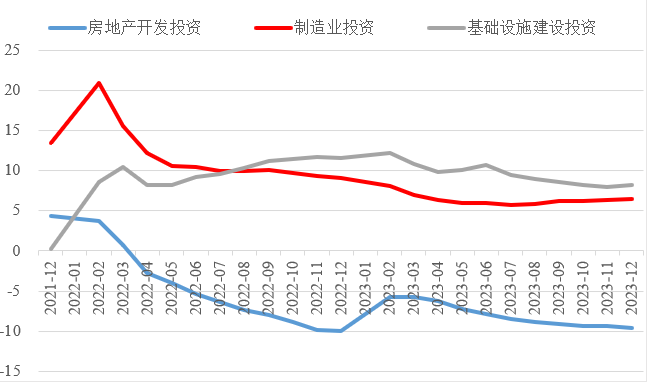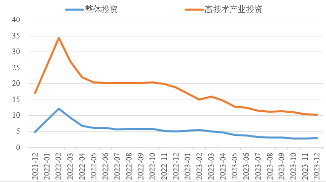 2023年,面對世界經濟復蘇乏力、國內自然災害頻發、改革發展穩定任務艱巨等多重挑戰,我國經濟回升向好,經濟轉型升級深入推進。投資對優化供給結構的關鍵作用更加凸顯,制造業投資持續向好,高技術產業投資占比穩步提高。同時,房地產投資仍未見底、民營經濟發展面臨較大壓力、地方政府債務擴展及外溢風險等突出問題制約投資持續穩定增長。做好2024年投資促進工作,需積極擴大有效益的投資,多舉措激發民間投資內生動力,全力穩定房地產投資預期,適度增加地方政府專項債券規模,加大重點領域補短板投資。 一、2023年整體投資增速有所放緩 2023年,我國固定資產投資(不含農戶)同比增長3%,增速較上年下降2.1個百分點,較前三季度、上半年、一季度分別下降0.1個、0.8個、2.1個百分點,固定資產投資增速逐季放緩。1—11月,建安工程、設備工器具購置、其他費用分別增長2.1%、6.7%、3.1%,建安工程投資增速明顯低于設備工器具購置投資增速,說明房屋、建筑物和設備裝置安裝等投資的活躍程度有所下降,體現技術水平的設備工器具投入增長加快。 圖1 全國固定資產投資增速(%) 數據來源:國家統計局 (一)民間投資動力不足。2023年,新冠疫情防控平穩轉段,疫情產生的“疤痕效應”仍待消除,需求收縮、供給沖擊、預期轉弱三重壓力尚在,民營企業面臨市場競爭加劇、利潤率下降、轉型升級難度增大、融資難融資貴等突出困難。全年民間固定資產投資253544億元,同比下降0.4%,較上年低了1.3個百分點,低于投資整體增速3.4個百分點。截至2023年12月底,我國民間固定資產投資已連續8個月負增長,民間固定資產投資占比連續7個月下降,跌至2011年以來的最低點,僅為50.4%,民間投資信心有待進一步提振。 圖2 民間投資增速及占比(%) 數據來源:國家統計局,Wind數據庫 (二)制造業投資保持較高韌性,房地產投資持續低迷。在中央預算內投資、地方政府專項債等資金的引導帶動下,基礎設施和制造業投資支撐作用更加顯著。2023年,中咨公司累計運行項目8421項,其中基礎設施投資與制造業投資項目占比近8成。我國計劃總投資億元及以上項目投資同比增長9.3%,拉動全部投資增長4.8個百分點,大項目投資帶動作用明顯。2023年,基礎設施投資同比增長8.24%,高于整體投資5.24個百分點,較2019年高了4.91個百分點。其中,鐵路運輸業投資、水利管理業投資分別增長25.2%、5.2%。制造業投資同比增長6.5%,高于整體投資增速3.5個百分點,較2019年高了3.4個百分點。制造業投資仍保持較高韌性,傳統產業高端化綠色化智能化轉型加快,電氣機械和器材制造業、汽車制造業投資分別增長32.2%、19.4%。 表1 1—12月我國各行業固定資產投資情況 數據來源:國家統計局,Wind數據庫 2023年,房地產開發投資增速持續放緩,房地產開發投資、住宅開發投資分別同比下降9.6%、9.3%。房地產開發投資占固定資產投資完成額的比重降至22%,較上年下降1.2個百分點,為3年以來最低值。房屋施工面積、房屋新開工面積等先行指標均出現明顯下滑,分別同比下降7.2%、20.4%。1—12月,國房景氣指數均位于100以下,自4月以來持續走低。 圖3 三大領域固定資產投資增速(累計同比,%) 數據來源:國家統計局,Wind數據庫 高技術產業投資引領帶動作用持續增強,集成電路、高端芯片、儀器儀表設備等領域關鍵核心技術攻關扎實推進,新能源、人工智能、生物醫藥等新興產業發展加快。2023年我國高技術產業投資增長10.3%,穩投資引領作用持續顯現。高技術制造業投資比上年增長9.9%,增速比制造業投資高3.4個百分點。其中,航空、航天器及設備制造業,計算機及辦公設備制造業,電子及通信設備制造業投資分別增長18.4%、14.5%、11.1%。高技術服務業投資比上年增長11.4%,增速比服務業投資高11個百分點。其中,科技成果轉化服務業、電子商務服務業投資分別增長31.8%、29.2%。高技術產業引資能力不斷增強,1—11月高技術產業引資3866.5億元人民幣,占全國實際使用外資總額的37.2%,較2022年全年提升1.1個百分點。 圖4 高技術產業投資增速對比整體投資增速(累計同比,%) 數據來源:國家統計局,Wind數據庫 (三)東部地區投資保持較快增長,東北地區投資延續負增長。今年以來,中咨公司承接31個省市委托的項目中,東部、中部、西部和東北地區占比分別為43%、16%、36%、5%。2023年,我國東部地區投資同比增長4.4%,較全國水平高了1.4個百分點;中部、西部地區投資增速由負轉正,分別同比增長0.3%、0.1%;東北地區投資同比下降1.8%,降幅較前三季度有所收窄。 圖5 分地區固定資產投資增速(累計同比,%) 數據來源:國家統計局,Wind數據庫 2023年1—11月,31個省份中有15個省投資增速高于全國水平,其中西藏、內蒙古、上海等3省市,因投資恢復動力較強或上年同期基數效應等,投資增速超過15%。天津、山西、黑龍江、江西、湖南、廣西、貴州、云南、陜西、青海等10省份,投資出現負增長,其中天津、黑龍江、廣西、云南降幅最大,分別同比下降17.8%、16.3%、14.9%、10.3%。 表2 1—11月全國各省固定資產投資情況 數據來源:國家統計局,Wind數據庫 二、面臨的主要問題及挑戰 (一)房地產供求關系深度調整從根本上制約著房地產投資的增長。2023年初,隨著疫情防控平穩轉段后的積壓需求較快釋放,我國房地產銷售出現一些積極變化;但在房地產市場供求關系發生重大變化的背景下,前期積壓的