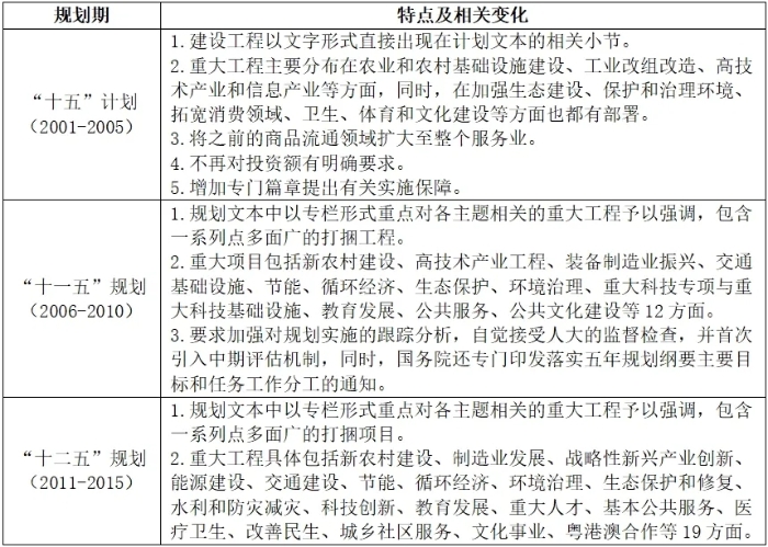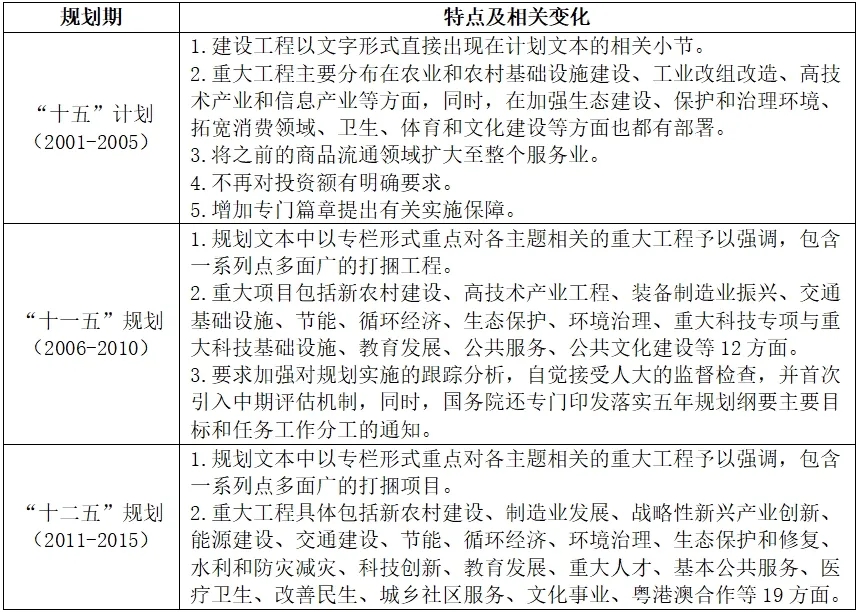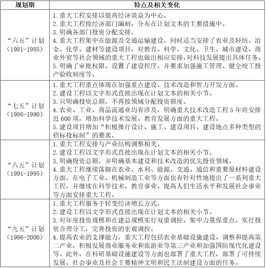 五年規(guī)劃(計劃)文本中重大工程的歷史回顧 李欣玨 曹玫 習(xí)近平總書記指出,編制和實施國民經(jīng)濟(jì)和社會發(fā)展五年規(guī)劃,是我們黨治國理政的重要方式。重大工程作為五年規(guī)劃(計劃)中的核心內(nèi)容,承載著實現(xiàn)國家戰(zhàn)略目標(biāo)的重要使命,也是衡量和體現(xiàn)國家綜合實力和發(fā)展水平的重要標(biāo)志。新中國成立以來,我國共編制和實施了14個五年規(guī)劃(計劃)。從“一五”計劃到“十四五”規(guī)劃,每一個五年規(guī)劃(計劃),國家都要確定百余項重大工程項目作為帶動經(jīng)濟(jì)社會發(fā)展的火車頭。14個五年規(guī)劃(計劃)確定的約兩千項重大工程項目,記錄著七十余年非凡成就背后的艱辛和輝煌。以五年規(guī)劃(計劃)為引領(lǐng),以重大工程項目為牽引,我國經(jīng)濟(jì)社會發(fā)展取得了全方位、開創(chuàng)性歷史成就,發(fā)生了深層次、根本性歷史變革,為建設(shè)社會主義現(xiàn)代化國家奠定了堅實基礎(chǔ)。即將迎來的“十五五”時期是我國承上啟下的重要時期,是2035年基本實現(xiàn)社會主義現(xiàn)代化的關(guān)鍵階段,也是七大深化改革任務(wù)的完成期,更是應(yīng)對復(fù)雜安全威脅的高危期,在“十五五”規(guī)劃中接續(xù)謀劃一批計長遠(yuǎn)、促發(fā)展、利民生的重大工程項目意義重大。 作為國內(nèi)規(guī)模最大的綜合性工程咨詢機構(gòu)和中央政府在投資建設(shè)領(lǐng)域的重要咨詢單位,自1982年成立以來,中國國際工程咨詢有限公司承擔(dān)了我國幾乎所有重大工程項目的咨詢評估任務(wù),深切感受到重大工程項目在現(xiàn)代化強國建設(shè)中發(fā)揮的重要作用。本文從歷史維度出發(fā),從計劃經(jīng)濟(jì)時期、計劃經(jīng)濟(jì)體制向社會主義市場經(jīng)濟(jì)體制轉(zhuǎn)軌時期、社會主義市場經(jīng)濟(jì)體制基本建立時期、社會主義市場經(jīng)濟(jì)體制完善時期等四個階段,對歷次五年規(guī)劃(計劃)文本中重大工程的特點及變化進(jìn)行系統(tǒng)回顧。 一、計劃經(jīng)濟(jì)體制時期(“一五”至“五五”) 有計劃地發(fā)展國民經(jīng)濟(jì),是新中國成立后的既定方針。為迅速恢復(fù)國民經(jīng)濟(jì)并推進(jìn)工業(yè)化進(jìn)程,借鑒前蘇聯(lián)經(jīng)驗,我國從1953年開始實施第一個五年計劃。“一五”計劃的基本任務(wù)是集中主要力量進(jìn)行以前蘇聯(lián)幫助中國設(shè)計的156個建設(shè)單位為中心的、由限額以上的694個建設(shè)單位組成的工業(yè)建設(shè),建立我國社會主義工業(yè)化的初步基礎(chǔ)。這一時期,重大工程項目主要集中在工業(yè)領(lǐng)域,項目涵蓋鋼鐵、煤炭、電力、機械、化工等多個行業(yè)。在第一屆全國人民代表大會第二次會議審議通過的《關(guān)于發(fā)展國民經(jīng)濟(jì)的第一個五年計劃的報告》中,各領(lǐng)域重大工程以文字形式體現(xiàn),一般出現(xiàn)在措施、要求、布局、任務(wù)等小節(jié),包括建設(shè)或改建長春第一汽車廠、鞍山鋼鐵聯(lián)合企業(yè)、沈陽第一機床廠等生產(chǎn)性企業(yè),以及建設(shè)武漢長江大橋、青藏鐵路、康藏公路等大型單體項目等。此外,還在計劃中明確了各行業(yè)領(lǐng)域的投資額度分配和生產(chǎn)性單位的產(chǎn)能目標(biāo),計劃性特點較為突出。此后,一大批舊中國沒有的基礎(chǔ)工業(yè)部門開始逐步建立,第一批國產(chǎn)汽車出廠、第一架國產(chǎn)飛機試飛、第一座原子反應(yīng)堆投入運轉(zhuǎn)。第一個五年計劃的實施奠定了新中國的工業(yè)化基礎(chǔ)。 表1 “一五”計劃中的156個重點項目 注:作者根據(jù)《第一個五年計劃(1953—1957)》等公開資料整理。 隨后,“二五”至“五五”計劃時期,國家相關(guān)部門未正式印發(fā)計劃文本。在此期間,雖受到“大躍進(jìn)”“文化大革命”等政治運動的干擾和影響,國家仍集中力量推進(jìn)了一批重大工程項目,如“兩彈一星”、南京長江大橋、成昆鐵路、劉家峽水電站和大慶油田等,這些項目在科技創(chuàng)新、基礎(chǔ)設(shè)施建設(shè)等方面取得了顯著成就。“一五”到“五五”,僅用5個五年計劃的時間,我國基本形成了獨立的、比較完整的工業(yè)體系和國民經(jīng)濟(jì)體系,為開展社會主義建設(shè)積累了經(jīng)驗。 二、計劃經(jīng)濟(jì)體制向社會主義市場經(jīng)濟(jì)體制轉(zhuǎn)軌時期(“六五”至“九五”) 改革開放后,我國逐步從計劃經(jīng)濟(jì)體制向社會主義市場經(jīng)濟(jì)體制轉(zhuǎn)軌。這一階段的五年計劃在繼續(xù)強調(diào)經(jīng)濟(jì)發(fā)展的同時,開始注重社會事業(yè)的協(xié)調(diào)發(fā)展,表明在發(fā)展戰(zhàn)略上,從片面追求工業(yè)特別是重工業(yè)產(chǎn)值產(chǎn)量的增長,開始轉(zhuǎn)向以提高經(jīng)濟(jì)效益為中心,注重農(nóng)輕重協(xié)調(diào)發(fā)展,注重經(jīng)濟(jì)、科技、教育、文化、社會的全面發(fā)展。計劃名稱也從“國民經(jīng)濟(jì)發(fā)展五年計劃”更名為“國民經(jīng)濟(jì)和社會發(fā)展五年計劃”。重大工程項目不再局限于工業(yè)領(lǐng)域,相應(yīng)擴展到農(nóng)業(yè)、交通、能源、科技、教育等多個領(lǐng)域。 表2 “六五”至“九五”計