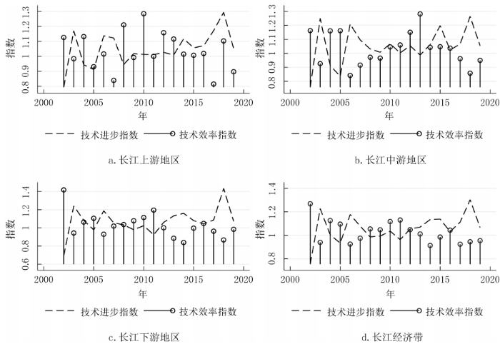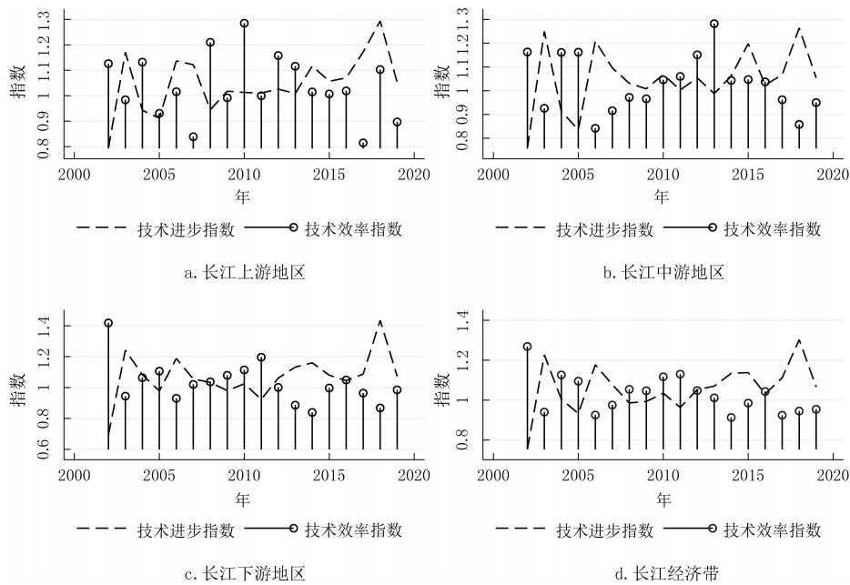 摘要:正確認識和研判長江經濟帶科技創新效率的變化特征有助于更好地發揮科技創新對經濟高質量發展的支撐作用。基于2002-2019年長江經濟帶沿線11省份的面板數據,利用GS-SBM模型測度了長江經濟帶的科技創新效率,分別使用Malmquist指數、Dagum基尼系數以及 Sigma收斂、Beta絕對(條件)收斂考察了長江經濟帶科技創新效率的演變、空間差距和收斂性。研究發現:長江經濟帶及其上、中、下游地區科技創新效率整體上而言保持提升趨勢,且存在較大空間差距,超變密度對總體差距的貢獻最大;長江經濟帶及其上、中、下游地區科技創新效率幾乎不存在Sigma收斂和Beta絕對(條件)收斂;長江經濟帶發展戰略實施之后,科技創新效率提高得更加明顯,并從技術進步與技術效率的雙重驅動轉變為更多地依靠技術進步,科技創新效率的擴散狀態更強。基于此,研究認為要科學辯證地看待區域科技創新效率的差距,發揮長江經濟帶發展戰略和科教興國戰略在提升和平衡科技創新效率中的積極作用。 關鍵詞:長江經濟帶;科技創新效率;時空格局;收斂性 科技創新是長江經濟帶建設現代經濟體系、實現高質量發展的戰略支撐,是推動中國式現代化的第一力量。經過多年的對外開放,長江經濟帶已經融入了全球分工體系,但是大量本土企業被鎖定在產業鏈或者產品價值鏈的中低端,必須依靠科技創新才能實現在全球價值鏈上的攀升。同時,雖然長江經濟帶是我國重要的現代工業集聚地,工業基礎扎實、規模龐大,但是關鍵核心技術仍然缺乏,尤其是在以美國為首的西方國家對華遏制和挑戰的情況下,需要以科技創新來解決“卡脖子”問題,加快實現高水平科技自立自強。此外,為了加快經濟增長,長江經濟帶沿線多個省市推進工業化和城鎮化,忽略了人與自然的和諧共生,導致長江沿線部分地區環境污染問題突出,生態功能退化,碳排放持續增加。基于此,無論是貫徹落實習近平總書記“共抓大保護、不搞大開發”的指示精神,還是如期或者率先實現碳達峰碳中和目標,都要求長江經濟帶沿線省市轉變發展模式,走生態優先、綠色低碳發展之路,發揮科技創新在經濟綠色轉型中的支撐作用。 由于科技創新本質上來講是一種知識生產過程,所以就存在科技創新成果的產出與科技創新資源和要素的投入比問題,即科技創新效率的高低,這種高低變化分別反映在時間和空間上差距:一是在某一區域內科技創新資源和要素投入的持續增長,并沒有帶來相應的科技創新產出數量增長或者質量的提升;二是將同樣的科技創新資源和要素投入到不同區域,其科技創新產出數量或者質量顯著不同。這兩個維度分別刻畫了區域內與區域間科技創新效率的差別,不僅影響了科技創新資源和要素的配置,而且也影響了科技創新對經濟發展的貢獻程度,成為區域發展不平衡的底層因素之一,給區域協調發展帶來了較大的挑戰。除此之外,我國依然是世界上最大的發展中國家,科技創新資源較歐美發達國家而言則相對稀缺,這就需要通過提高科技創新效率來實現科技創新資源的最大化利用。 為了更加充分和有效地利用長江經濟帶科技創新資源,促進長江經濟帶經濟高質量發展,就必須正視科技創新效率在時間和空間上的演變,科學認識科技創新效率向高水平收斂的機制,因此,不僅要考察長江經濟帶科技創新效率的動態變化規律,還需要充分考慮科技創新效率的區域不平衡問題,即其上、中、下游地區之間以及各自內部科技創新效率的差距變化。本文首先基于數據包絡方法測度了長江經濟帶及其上、中、下游地區的科技創新效率,分解了導致科技創新效率變化的驅動因素,然后利用dagum基尼系數考察了長江經濟帶及其上、中、下游地區的科技創新效率的空間差距及其形成來源,接著分別采用Sigma收斂和Bate收斂來檢驗了長江經濟帶及其上、中、下游地區的科技創新效率的收斂性,最后給出了相關對策啟示。 一、文獻綜述 多年來,我國一直高度重視科技創新在國民經濟發展中的重要作用,將推動科技創新做為黨治國理政的核心內容之一。在中國共產黨第二十次全國代表大會報告提出“必須堅持科技是第一生產力、人才是第一資源、創新是第一動力”。鑒于此,有學者圍繞我國科技創新問題從多個角度展開了研究,取得了一批較高質量的成果。這里針對本文的研究目的,主要對科技創新效率方面的相關研究進行了綜述。 從現有研究看,針對科技創新效率的測度方法主要是隨機前沿模型(SFA)和數據包絡分析(DEA)。由于SFA 模型屬于參數方式,所以在使用它測度科技創新效率時不僅要事先明確投入變量與產出變量之間的函數關系,而且對變量的平穩性和變量之間的協整關系要求較高。DEA方法采用線性規劃技術測算效率,除了不需要事先確定生產函數的形式,還能夠完成多投入多產出情形下的科技效率測度,實現不同樣本點與效率最優點之間的比較,因此被廣泛地采用。譬如,劉愛芹等[1] 、孫凱[2] 、李婧等[3] 、李南等[4] 、李政等[5]利用傳統的徑向DEA模型對不同區域的創新效率進行了測算,但傳統徑向DEA模型存在松弛變量、跨期比較和有效率決策單元效率比較等諸多問題,影響了效率測度結果的可靠性,從而推動了新拓展的DEA方法在測度科技創新效率上的應用。其中,王春枝等[6]利用非徑向超效率DEA模型測度了我國區域創新效率的動