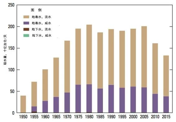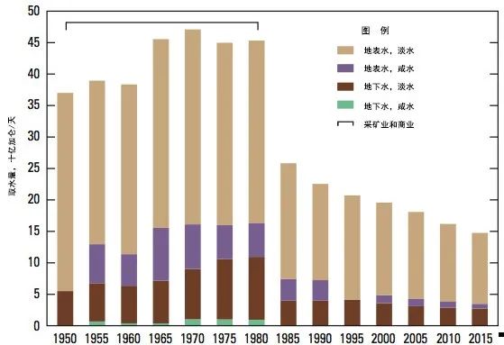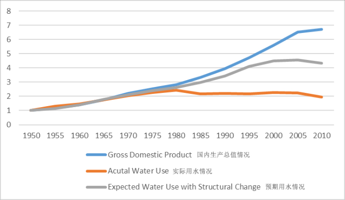 編者按:《2021年聯(lián)合國世界水發(fā)展報(bào)告》提出,全球新水使用量在過去100年中增加了6倍,自20世紀(jì)80年代以來以每年約1%的速度增加。預(yù)計(jì)至2050年全球用水量仍將以類似的速度繼續(xù)增長,且增長主要集中在中低收入國家,尤其是新興經(jīng)濟(jì)體[1]。 為進(jìn)一步把握好我國水資源未來需求趨勢(shì),我們深入分析研究了一些典型國家的用水態(tài)勢(shì)變化情況及水資源管理經(jīng)驗(yàn),以期為我國做好水資源需求研判以及科學(xué)指導(dǎo)水工程規(guī)劃建設(shè)提供參考。本公眾號(hào)將研究成果以系列文章的方式陸續(xù)刊發(fā),本文為系列研究之一,供業(yè)界同仁參考。 美國用水變化態(tài)勢(shì)對(duì)我國的啟示 姜富華 邢智慧 紀(jì)興華 一、1950年以來美國用水量變化態(tài)勢(shì)分析 (一)1950年以來美國用水量變化情況 2015年美國總用水量約為4449億立方米,其中淡水約為3883億立方米,占比為87%;咸水約為566億立方米,占比為13%。 從1950年至2015年間美國總用水量的變化情況看,其總體呈先增后降的態(tài)勢(shì)(見圖1)。以1980年為轉(zhuǎn)折點(diǎn),1950-1980年間美國總用水量隨著人口和經(jīng)濟(jì)的增長持續(xù)增長,1980年美國總用水量約為1950年的2.4倍;1980年以后,受產(chǎn)業(yè)結(jié)構(gòu)調(diào)整、技術(shù)進(jìn)步、用水效率提高等因素綜合影響,美國總用水量呈現(xiàn)了總體下降的態(tài)勢(shì),2015年總用水量比用水高峰的1980年減少了約25%。 美國淡水取用量與總用水量變化態(tài)勢(shì)一致(見圖2)。1980-2015年間美國淡水總用水量下降了27%,此期間美國人口增長了約42%,GDP增長了5倍以上[2]。 數(shù)據(jù)來源:美國地質(zhì)調(diào)查局統(tǒng)計(jì)。 注:①不同時(shí)段取水量統(tǒng)計(jì)口徑略有差異;②取水量等于毛用水量。 圖1 1950-2015年美國總?cè)∮盟考胺诸惾∮盟孔兓瘧B(tài)勢(shì) 數(shù)據(jù)來源:美國地質(zhì)調(diào)查局統(tǒng)計(jì)。 圖2 1950-2015年美國淡水取用水量與人口變化態(tài)勢(shì) 有研究[3]繪制了以1950年為基準(zhǔn),至2010年美國GDP與用水量間的關(guān)系變化情況圖(見圖3)。藍(lán)色線為實(shí)際GDP變化,橙色線為實(shí)際用水量變化,灰色線為考慮產(chǎn)業(yè)結(jié)構(gòu)變化、不考慮技術(shù)改進(jìn)情況下的預(yù)測(cè)用水變化。藍(lán)色線與橙色線的剪刀走向表明:早在1980年,美國用水量已與GDP脫鉤。藍(lán)色線與灰色線、灰色線與橙色線的剪刀走向表明:導(dǎo)致脫鉤的重要因素是用水效率提升和經(jīng)濟(jì)結(jié)構(gòu)變化。 數(shù)據(jù)來源:數(shù)據(jù)來自[3];1950=1 圖3 1950-2010年美國總用水量與經(jīng)濟(jì)變化關(guān)系分析 (二)主要行業(yè)用水量變化情況 美國用水類別中,熱電、灌溉、公共和自供工業(yè)用水量是排在前4名的用水戶,其用水總量占美國總用水量的比重超過90%,見圖4。本文重點(diǎn)分析多年來美國熱電、灌溉、公共和自供工業(yè)用水的變化情況。 數(shù)據(jù)來源:美國地質(zhì)調(diào)查局。 圖4 2015年美國分類取用水量統(tǒng)計(jì) 1.熱電用水變化態(tài)勢(shì) 熱電是美國最大的用水對(duì)象。2015年美國熱電用水量約為1838億立方米,占總用水量的41%左右,見圖5。美國熱電用水基本來自地表水,且以淡水為主。2015年美國熱電用水量比2010年降低18%左右,用水效率由2010年的71.9升/千瓦時(shí)降低到2015年的56.8升/千瓦時(shí)。 數(shù)據(jù)來源:美國地質(zhì)調(diào)查局。 圖5 1950-2015年美國熱電用水量變化態(tài)勢(shì) 2.灌溉用水變化態(tài)勢(shì) 美國灌溉用水量占總用水量的40%左右,僅次于熱電用水。2015年美國灌溉面積超過3.5億畝,其中噴灌、微灌面積比重分別為55%和8.6%左右,灌溉總用水量約為1630億立方米(占總用水量的37%左右),地表和地下水源灌溉供水比重分別為52%和48%。由于降雨豐枯變化,美國灌溉水量年際間有波動(dòng),但從大的變化趨勢(shì)看,1980年以來總體呈下降趨勢(shì),2015年灌溉水量比1980年減少了21%,見圖6。 數(shù)據(jù)來源:美國地質(zhì)調(diào)查局。 圖6 1950-2015年美國灌溉用水量變化態(tài)勢(shì) 灌溉用水受水資源條件、灌溉面積、種植結(jié)構(gòu)、灌溉設(shè)施、灌溉效率等多種因素影響。據(jù)美國農(nóng)業(yè)部統(tǒng)計(jì),美國灌溉面積快速增長,從1890年的不足1821萬畝增長到2017年的3.52億畝左右,見圖7。但與此同時(shí),實(shí)際灌溉用水強(qiáng)度有所下降,1969-2017年單位面積平均灌溉水量從406立方米/畝下降至304立方米/畝,這是農(nóng)業(yè)種植模式調(diào)整、灌溉設(shè)施與技術(shù)采用和灌溉效率提高等綜合作用的結(jié)果。 數(shù)據(jù)來源:美國農(nóng)業(yè)部。 圖7 1890-2018年美國灌溉面積和單位面積灌溉用水量變化態(tài)勢(shì) 美國灌溉用水結(jié)構(gòu)不斷變化,主要表現(xiàn)為玉米和大豆的灌溉面積顯著增加。1964年美國主要灌溉農(nóng)作物是棉花和牧草,玉米和大豆加起來不到1518萬畝。2017年玉米灌溉面積超過7284萬畝,大豆灌溉面積超過5463萬畝,見圖8。 數(shù)據(jù)來源:美國農(nóng)業(yè)部。 圖8 1964-2017年美國主要農(nóng)作物灌溉面積變化態(tài)勢(shì) 同時(shí),美國越來越注重高效節(jié)水灌溉技術(shù)的運(yùn)用。美國農(nóng)業(yè