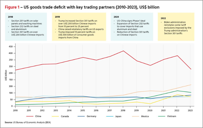 摘要 8月13日,辛里奇基金會貿(mào)易政策主管黛博拉·埃爾姆斯發(fā)表文章《特朗普如何塑造21世紀美國貿(mào)易政策》。文章指出,特朗普第一個任期以貿(mào)易為主導,主要是將美國的國家和安全利益置于前沿和中心位置,將貿(mào)易作為美國外交和戰(zhàn)略政策的武器,但現(xiàn)在已“根植”在華盛頓兩黨、兩院和長期政策制定中。因此,在評估美國貿(mào)易和經(jīng)濟政策制定方式的急劇轉(zhuǎn)變時,有五點轉(zhuǎn)變值得注意,其始于特朗普政府時期,并在拜登政府時期延續(xù)。 正文 隨著即將到來的美國總統(tǒng)選舉的民調(diào)結(jié)果愈發(fā)緊張,貿(mào)易觀察人士正密切關(guān)注唐納德·特朗普總統(tǒng)第一任期的經(jīng)驗教訓以及他重返白宮的計劃。特朗普代表著與過去美國貿(mào)易政策做法的徹底決裂,但他對國內(nèi)普遍情緒的利用程度足夠深,以至于他的許多政策在拜登總統(tǒng)任期內(nèi)得以延續(xù),而且無論誰入主白宮,他的政策似乎都將繼續(xù)下去。 貿(mào)易和經(jīng)濟是特朗普議程的核心。多年來,他對許多其他議題的立場發(fā)生了變化,但他始終專注于貿(mào)易。這是他擔任總統(tǒng)之前就存在的一個目標。1987年,他在《紐約時報》上刊登了一整頁廣告,抗議當時他認為不公平的貿(mào)易行為,尤其是日本的貿(mào)易行為,他認為這種行為削弱了美國。這已經(jīng)預示了他后來擔任總統(tǒng)時將采取的提高關(guān)稅的舉措。 特朗普就任總統(tǒng)后,貿(mào)易政策成為“特朗普政策指南針的四個要點”之一。事實證明,這一貿(mào)易指南針非常耐用,他和他的團隊對美國政策做出的許多改變在他離開白宮后仍然有效。特朗普政府為重新定位美國長期政策制定而采取的立場現(xiàn)在似乎已“根植”在華盛頓的決策中。 在評估美國貿(mào)易和經(jīng)濟政策制定方式的急劇轉(zhuǎn)變時,有幾點值得注意,這種轉(zhuǎn)變始于特朗普時期,并在拜登時期基本延續(xù)。這些包括 1.推動白宮和行政部門的貿(mào)易政策; 2.重新使用單邊貿(mào)易工具; 3.重新制定貿(mào)易政策以適應經(jīng)濟戰(zhàn); 4.與經(jīng)濟盟友的關(guān)系發(fā)生變化; 5.貿(mào)易利益與國家安全利益相混淆; 6.全球貿(mào)易體系多邊規(guī)則制定削弱。 特朗普在實施貿(mào)易議程方面之所以有效,得益于美國政治制度的特殊性。盡管美國憲法明確賦予國會管理稅收(以及關(guān)稅)的權(quán)力,但美國總統(tǒng)和行政部門在貿(mào)易和經(jīng)濟問題上仍有很大的回旋余地。自2017年1月,特朗普上任第一天單方面宣布退出跨太平洋伙伴關(guān)系協(xié)定(TPP)以來,美國貿(mào)易政策在很大程度上是由白宮推動的,國會對此沒有施加太大壓力。 在拜登政府的領導下,貿(mào)易政策繼續(xù)由行政部門制定。拜登和特朗普一樣,繞過國會就貿(mào)易和經(jīng)濟問題發(fā)布了一系列行政命令。他進一步將貿(mào)易政策制定權(quán)集中在白宮,而美國貿(mào)易代表辦公室(USTR)的作用則大大受限。美國商務部在印太經(jīng)濟繁榮框架(IPEF)中發(fā)揮了核心作用,該框架要求調(diào)整美國國內(nèi)政策流程,以允許美國商務部參與國際談判。 其次,特朗普選擇了里根政府的貿(mào)易律師兼高級貿(mào)易官員羅伯特·萊特希澤擔任美國貿(mào)易代表,萊特希澤對美國政治和政策制定體系有著豐富的知識和經(jīng)驗。萊特希澤與彼得·納瓦羅和威爾伯·羅斯等其他顧問一起制定了許多美國法規(guī)和政策,這些法規(guī)和政策在很大程度上已經(jīng)擱置了數(shù)年甚至數(shù)十年。萊特希澤被任命為美國貿(mào)易代表后,得以重啟國內(nèi)工具,例如有關(guān)不公平貿(mào)易行為的第301條款或有關(guān)國家安全的第232條款。 同樣,拜登政府繼續(xù)使用了許多這些具體的工具。對鋼鐵和鋁征收的232條款關(guān)稅仍然有效,對中國產(chǎn)品的301條款關(guān)稅也是如此。拜登于2024年7月20日通過公告宣布了新的鋼鐵232條款申請。2024年8月,還對一組新的中國產(chǎn)品征收了301條款關(guān)稅。 特朗普最初貿(mào)易議程的第三個重要領域是對貿(mào)易政策目的的重大重新評估。301條款或232條款等工具被用來實現(xiàn)其目標,其根源在于美國正在經(jīng)歷一場經(jīng)濟戰(zhàn)。特朗普的論點被萊特希澤巧妙運用和實施,他認為過去的做法尤其是貿(mào)易協(xié)定的使用以及他們認為過去政府未能妥善執(zhí)行這些協(xié)定的做法,加速了美國的衰落。 雖然拜登執(zhí)政期間大部分政策調(diào)整都得以實施,但特朗普的一項關(guān)鍵指標被取消了。特朗普將雙邊貿(mào)易逆差的規(guī)模視為衡量美國是否從貿(mào)易中獲益的標準。與美國存在大量商品貿(mào)易逆差的國家被認為采用了不恰當?shù)馁Q(mào)易做法。 圖1和圖2顯示,盡管特朗普重新調(diào)整貿(mào)易政策并重點關(guān)注雙邊貿(mào)易逆差,但除非疫情扭曲趨勢,否則美國貿(mào)易流并沒有持續(xù)響應特朗普政府的政策。 特朗普對貿(mào)易政策的調(diào)整包括改變與合作伙伴和盟友的關(guān)系。特朗普在與外國政府,包括關(guān)鍵人物打交道時被稱為交易型。 特朗普對貿(mào)易和經(jīng)濟領域長期存在的聯(lián)盟和伙伴關(guān)系表現(xiàn)出的普遍漠視也意味著,他