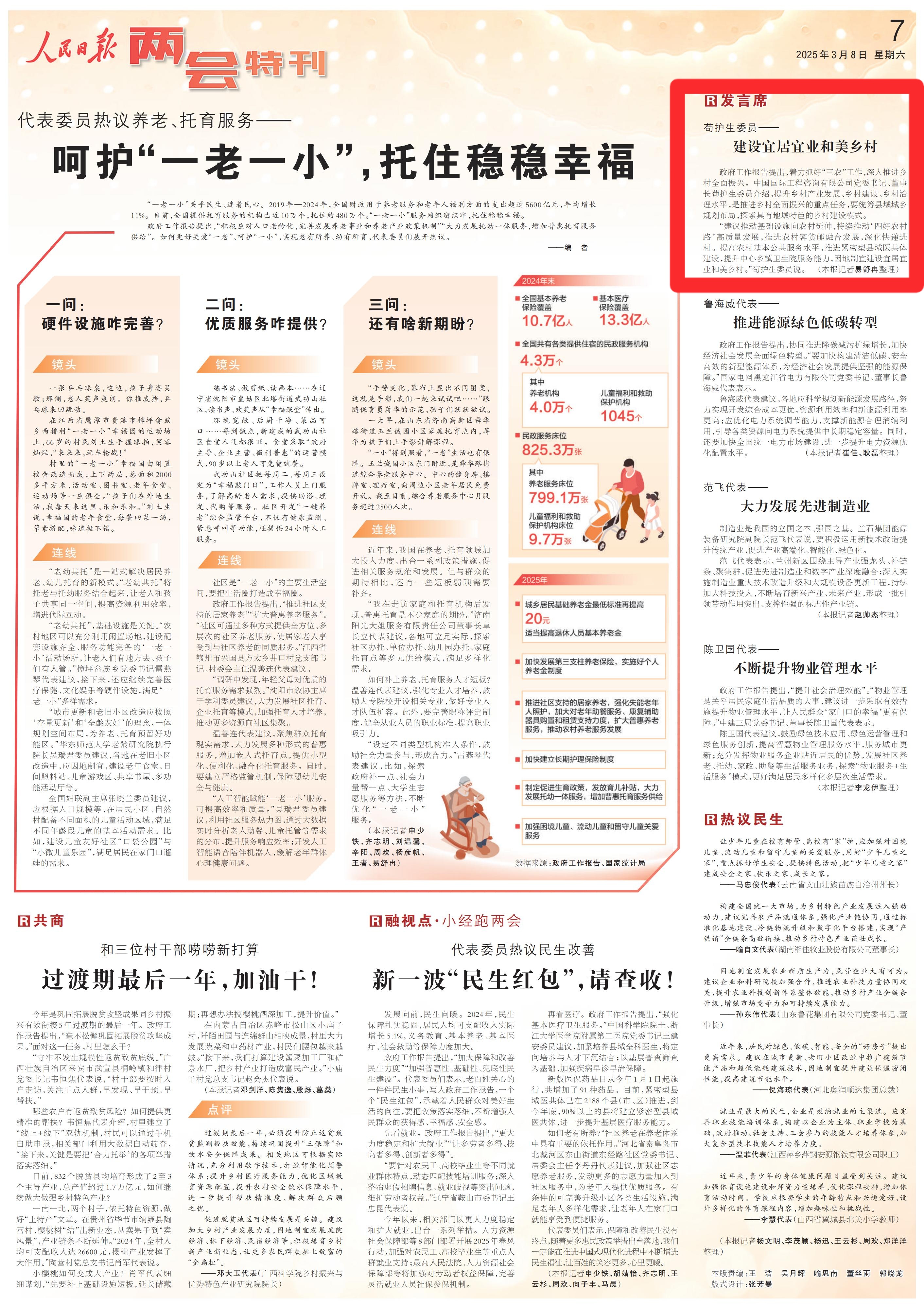 茍護(hù)生委員—— 建設(shè)宜居宜業(yè)和美鄉(xiāng)村 政府工作報(bào)告提出,著力抓好“三農(nóng)”工作,深入推進(jìn)鄉(xiāng)村全面振興。中國國際工程咨詢有限公司黨委書記、董事長茍護(hù)生委員介紹,提升鄉(xiāng)村產(chǎn)業(yè)發(fā)展、鄉(xiāng)村建設(shè)、鄉(xiāng)村治理水平,是推進(jìn)鄉(xiāng)村全面振興的重點(diǎn)任務(wù),要統(tǒng)籌縣域城鄉(xiāng)規(guī)劃布局,探索具有地域特色的鄉(xiāng)村建設(shè)模式。 “建議推動基礎(chǔ)設(shè)施向農(nóng)村延伸,持續(xù)推動‘四好農(nóng)村路’高質(zhì)量發(fā)展,推進(jìn)農(nóng)村客貨郵融合發(fā)展,深化快遞進(jìn)村。提高農(nóng)村基本公共服務(wù)水平,推進(jìn)緊密型縣域醫(yī)共體建設(shè),提升中心鄉(xiāng)鎮(zhèn)衛(wèi)生院服務(wù)能力,因地制宜建設(shè)宜居宜業(yè)和美鄉(xiāng)村。”茍護(hù)生委員說。 (本報(bào)記者易舒冉整理) 魯海威代表—— 推進(jìn)能源綠色低碳轉(zhuǎn)型 政府工作報(bào)告提出,協(xié)同推進(jìn)降碳減污擴(kuò)綠增長,加快經(jīng)濟(jì)社會發(fā)展全面綠色轉(zhuǎn)型。“要加快構(gòu)建清潔低碳、安全高效的新型能源體系,為經(jīng)濟(jì)社會發(fā)展提供堅(jiān)強(qiáng)的能源保障。”國家電網(wǎng)黑龍江省電力有限公司黨委書記、董事長魯海威代表表示。 魯海威代表建議,各地應(yīng)科學(xué)規(guī)劃新能源發(fā)展路徑,努力實(shí)現(xiàn)開發(fā)綜合成本更優(yōu),資源利用效率和新能源利用率更高;應(yīng)優(yōu)化電力系統(tǒng)調(diào)節(jié)能力,支撐新能源合理消納利用,引導(dǎo)各類資源向電力系統(tǒng)提供中長期穩(wěn)定容量。同時(shí),還要加快全國統(tǒng)一電力市場建設(shè),進(jìn)一步提升電力資源優(yōu)化配置水平。 (本報(bào)記者崔佳、耿磊整理) 范飛代表—— 大力發(fā)展先進(jìn)制造業(yè) 制造業(yè)是我國的立國之本、強(qiáng)國之基。蘭石集團(tuán)能源裝備研究院副院長范飛代表說,要積極運(yùn)用新技術(shù)改造提升傳統(tǒng)產(chǎn)業(yè),促進(jìn)產(chǎn)業(yè)高端化、智能化、綠色化。 范飛代表表示,蘭州新區(qū)圍繞主導(dǎo)產(chǎn)業(yè)強(qiáng)龍頭、補(bǔ)鏈條、聚集群,促進(jìn)先進(jìn)制造業(yè)和數(shù)字產(chǎn)業(yè)深度融合;深入實(shí)施制造業(yè)重大技術(shù)改造升級和大規(guī)模設(shè)備更新工程,持續(xù)加大科技投入,不斷培育新興產(chǎn)業(yè)、未來產(chǎn)業(yè),形成一批引領(lǐng)帶動作用突出、支撐性強(qiáng)的標(biāo)志性產(chǎn)業(yè)鏈。 (本報(bào)記者趙帥杰整理) 陳衛(wèi)國代表—— 不斷提升物業(yè)管理水平 政府工作報(bào)告提出,“提升社會治理效能”。“物業(yè)管理是關(guān)乎居民家庭生活品質(zhì)的大事,建議進(jìn)一步采取有效措施提升物業(yè)管理水平,讓人民群眾‘家門口的幸福’更有保障。”中建三局黨委書記、董事長陳衛(wèi)國代表表示。 陳衛(wèi)國代表建議,鼓勵(lì)綠色技術(shù)應(yīng)用、綠色運(yùn)營管理和綠色服務(wù)創(chuàng)新,提高智慧物業(yè)管理服務(wù)水平,服務(wù)城市更新;充分發(fā)揮物業(yè)服務(wù)企業(yè)貼近居民的優(yōu)勢,發(fā)展社區(qū)養(yǎng)老、托幼、家政、助餐等生活服務(wù)業(yè)務(wù),探索“物業(yè)服務(wù)+生活服務(wù)”模式,更好滿足居民多樣化多層次生活需求。 (本報(bào)記者李龍伊整理) | |||||