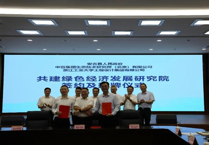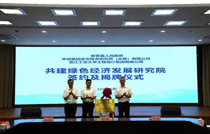 儀式上,葉建軍,劉富榮,浙江工業大學工程設計集團黨總支副書記王才領,安吉縣委常委、常務副縣長黃楓分別致辭,并共同見證簽約與揭牌。中咨生態所總經理田煜代表公司簽署共建協議,中咨生態所執行董事王才君與各方領導一同為綠色經濟發展研究院揭牌。