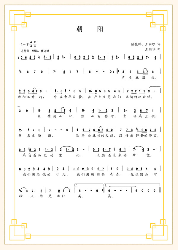 《朝陽》是一首青年人的歌曲,曲風(fēng)為進(jìn)行曲,堅(jiān)定豪邁、有力、朝氣蓬勃,體現(xiàn)了新一代中咨青年牢記囑托、砥礪前行,忠于理想、不斷進(jìn)取的精神風(fēng)貌,以堅(jiān)定的理想信念,勇立時代潮頭;以過硬的業(yè)務(wù)本領(lǐng),挑起時代重?fù)?dān);以飽滿的工作熱情,甘做時代激流。此曲被《中國曲譜網(wǎng)》登錄,此次創(chuàng)作是我公司為職工歌曲創(chuàng)作的一次展示,展現(xiàn)了廣大職工開拓創(chuàng)新、愛崗敬業(yè)、爭創(chuàng)一流的精神豐貌。